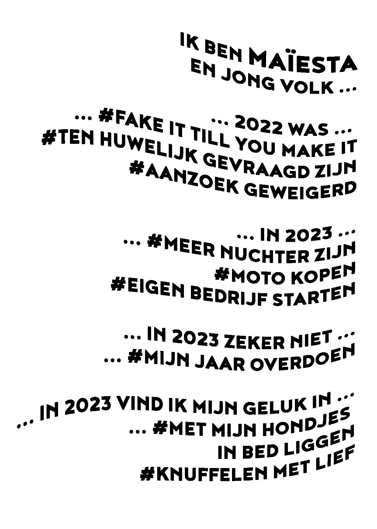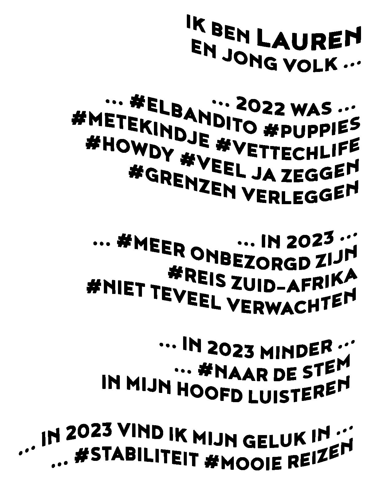 “... GELUK IN 2023 IS ... TO BE UNAPOLOGETICALLY ME . IK WIL ONTDEKKEN WAT GELUK VOOR MIJ BETEKENT EN DAAR HÉÉL VÉÉL IN INVESTEREN. IK VIND GELUK INKLEINEDINGEN...INVRIENDEN,INFAMILIE...MAARWATMIJN‘BIGGERPICTURE’ VAN GELUK IS, HOOP IK ELK JAAR OPNIEUW VERDER UIT TE ZOEKEN EN TE VINDEN ...”