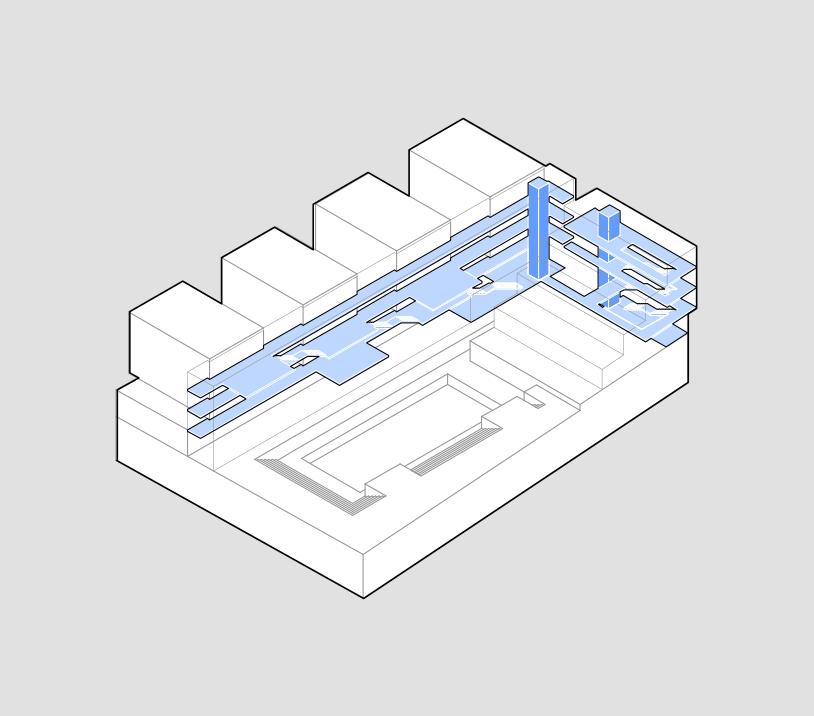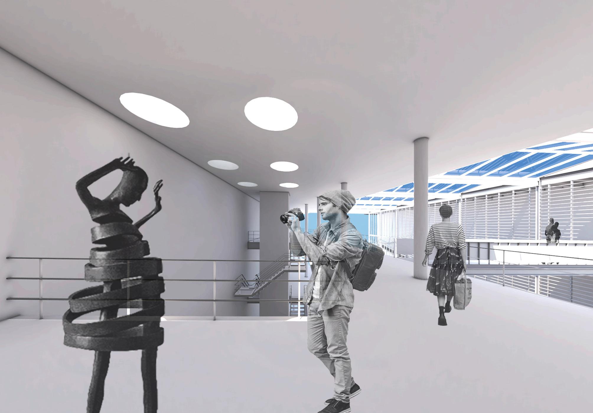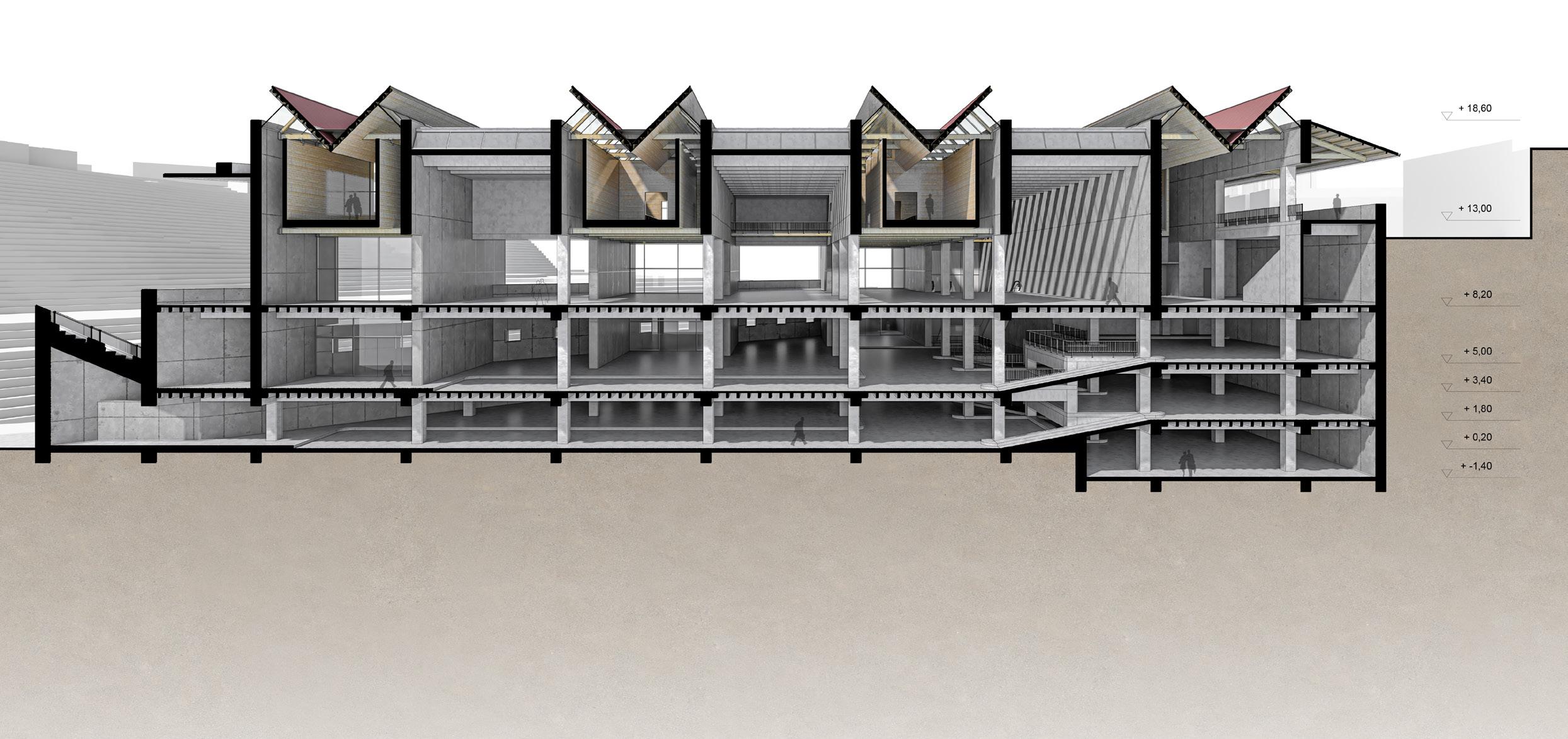 The urban passage is conceived as a great atrium that is surrounded by the main circulation aisles of the building and it is covered by a roof that permit natural sun light, in order to give prominence and scale to the passage while maintaining a visual relation between the urban space and the cultural center.
