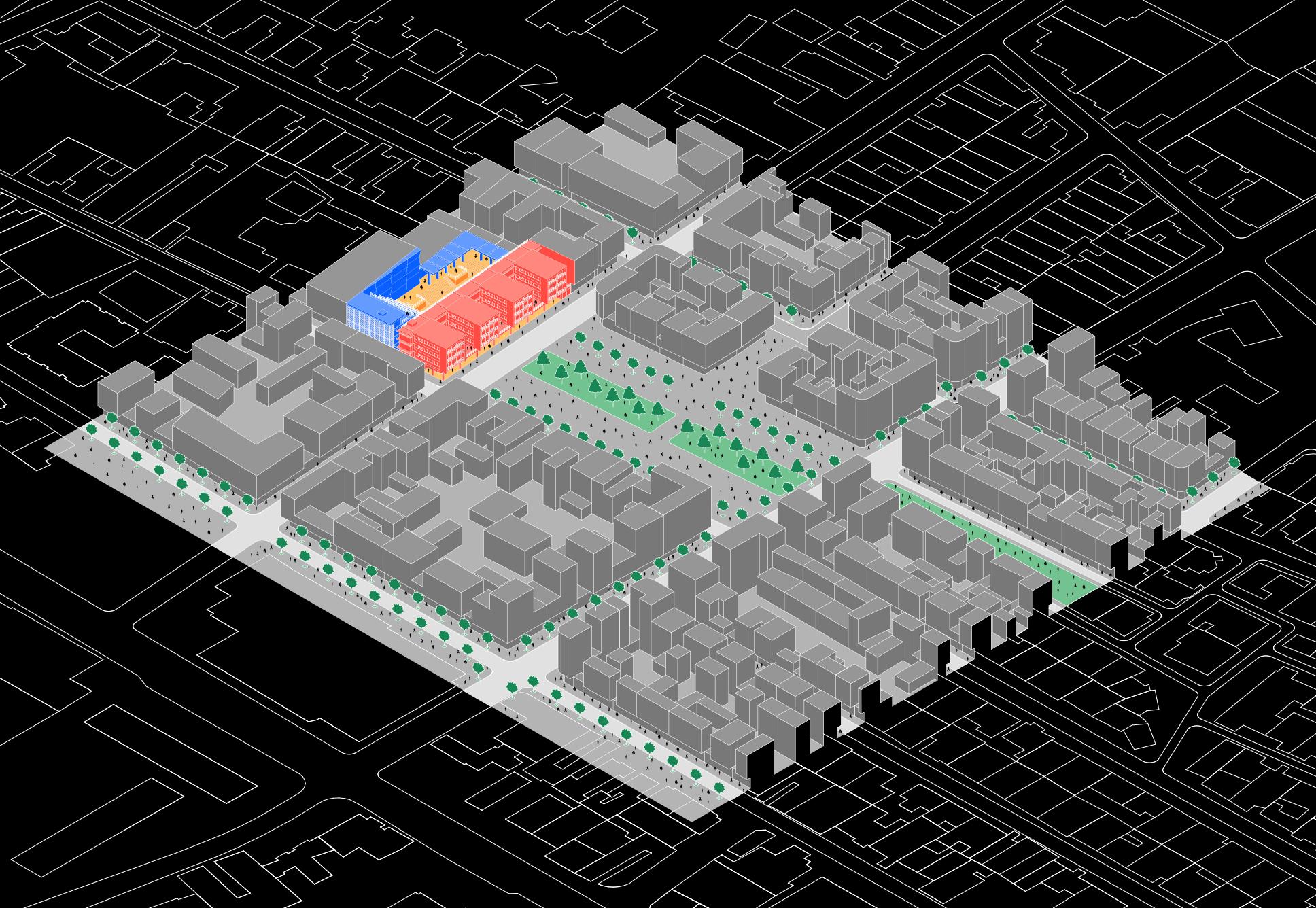 As part of the master plan to restructure the historic center of Petare, a vehicular road is proposed to surround the neighborhood, limiting vehicular access and prioritizing pedestrian traffic, implementing the superblock concept.