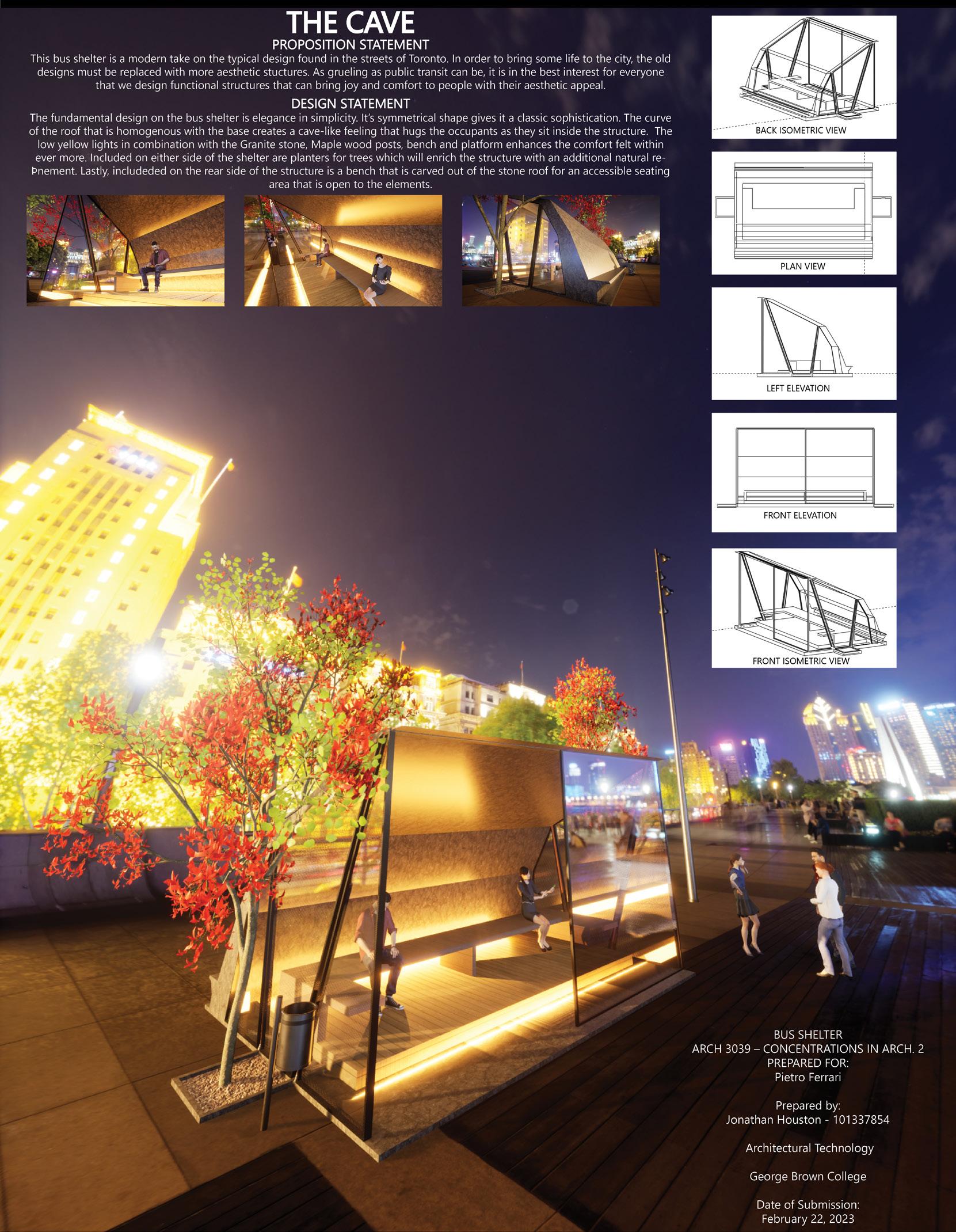The Bus Shelter Project was a creative work project that was given to us to complete in one week. The only requirements were to design and present a minimum 10’ x 12’ bus shelter using the presentation and software skills we have developed throughout our education.