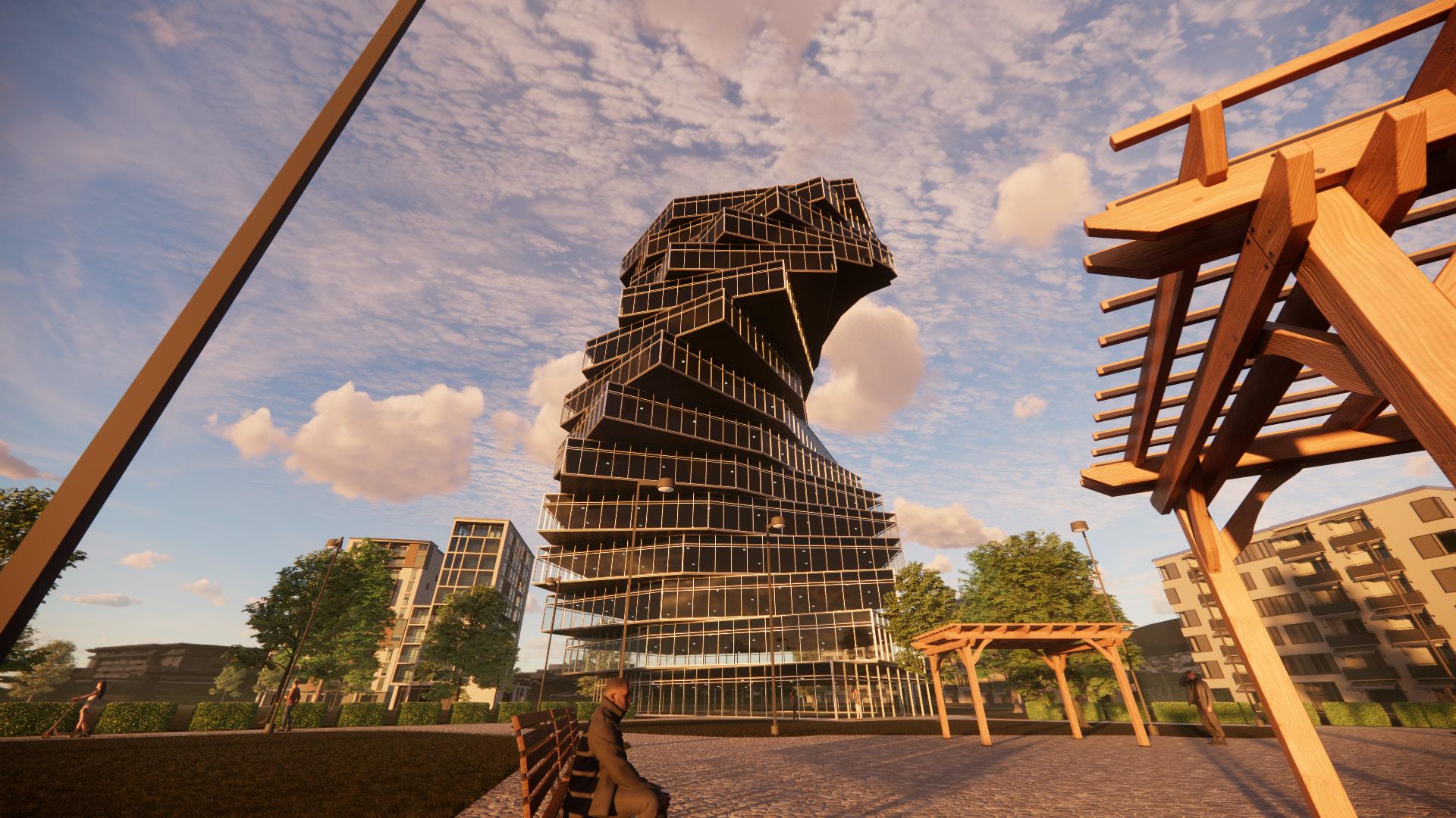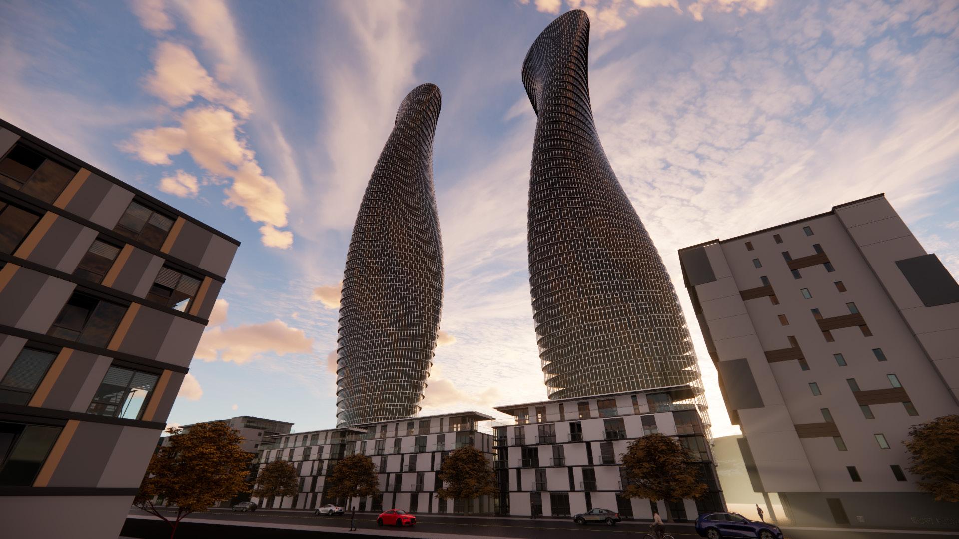 To test our skills in Dynamo, Revit, I was tasked with finding a precedent building to remodel using the Dynamo software. I chose the Absolute World, also known as the Marilyn Monroe Towers, in Mississauga, ON. It is 50 levels of ellipses continuously rotating about the z-axis. I then pulled the towers into Enscape and rendered them for a perspective view from street level.