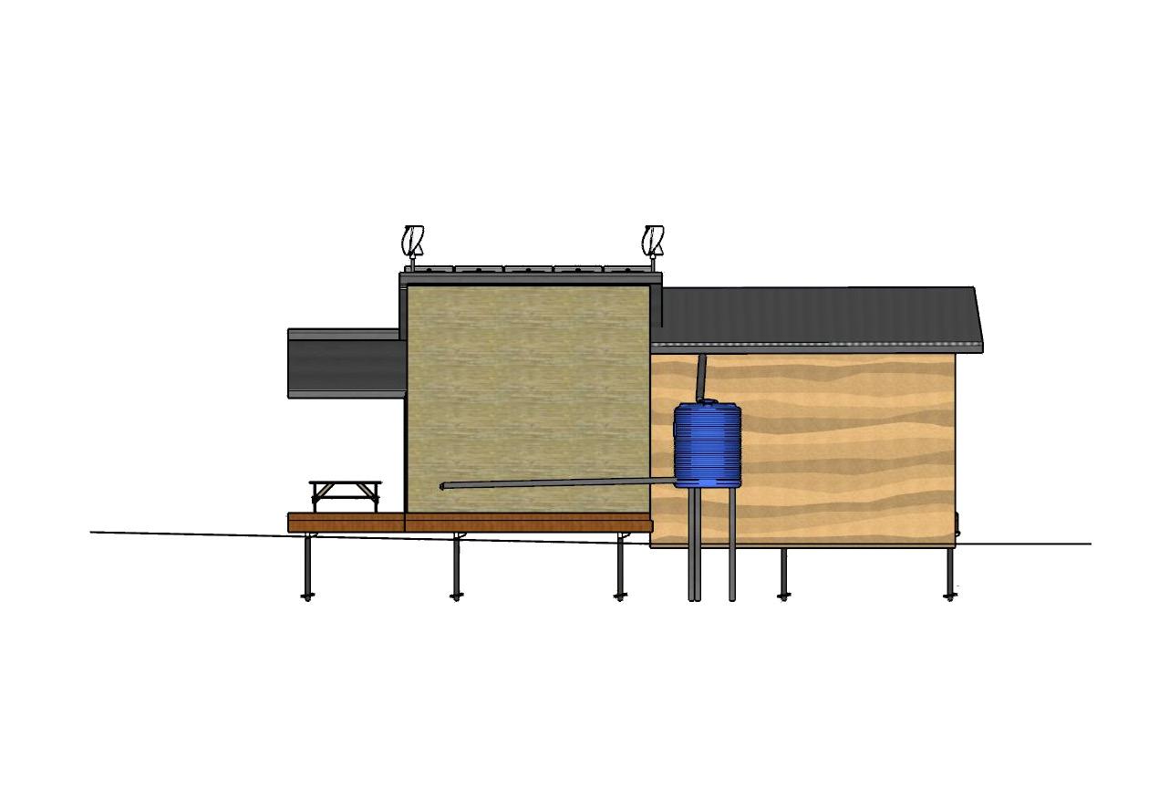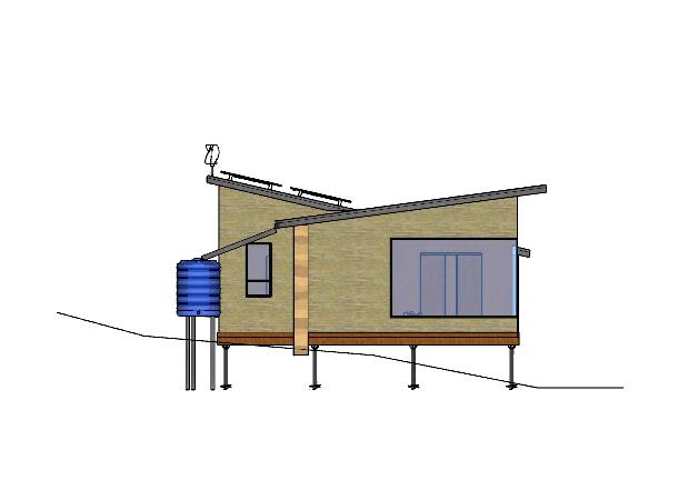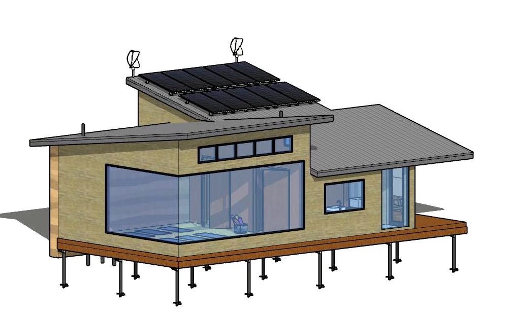 The building is supported on helical piles drilled into the existing terrain to minimize the demoliiton to the site. Any soild that had to be excavated was then put into the Rammed Earth Wall on the rear side of the yoga studio. This wall also functions as a geothermal heating element due to its high thermal storage capacity. The angle of the roofs allow the sun to heat the studio space in the winter and create enough shade to keep it cool in the summer. Solar panels, wind turbines and reusable rain water systems would be installed as