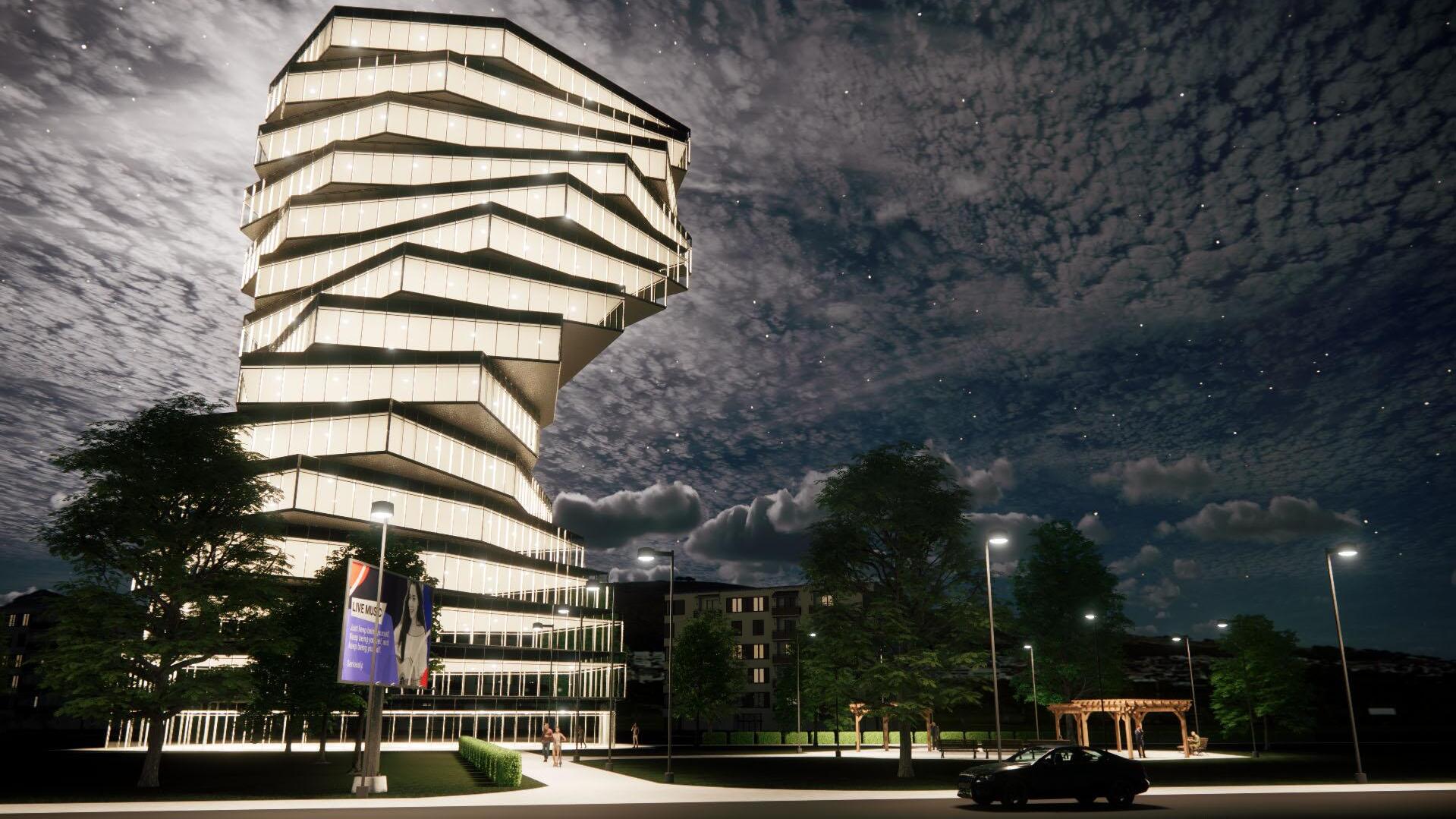 In this Project, I was tasked with creating a 10,000 sq. ft building with 16 levels, exclusively through Dynamo within Revit. Once completed, I then used Enscape to complete the render you see below. I enjoy this night render through the use of the artifical lights that help accentuate the shape and rotation of the building. On the next page I have desplayed two more renders, both are in the day time, and both have different perspectives and field of view.