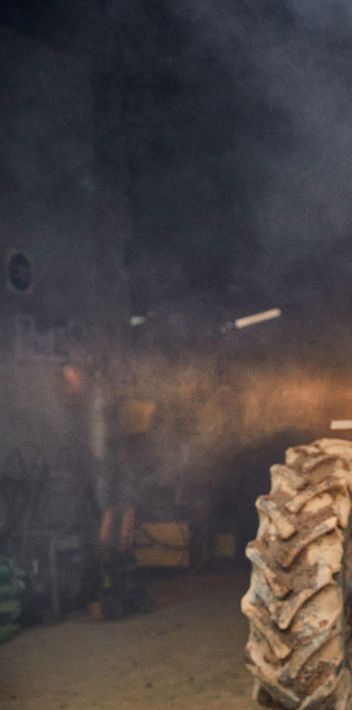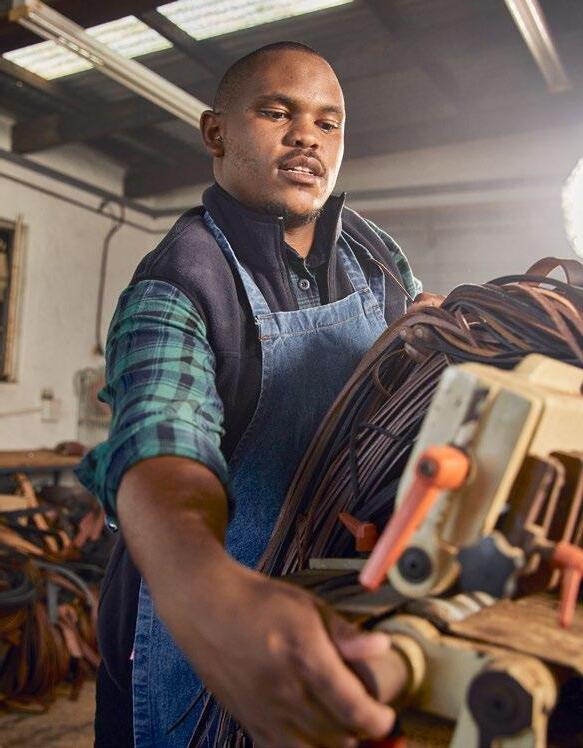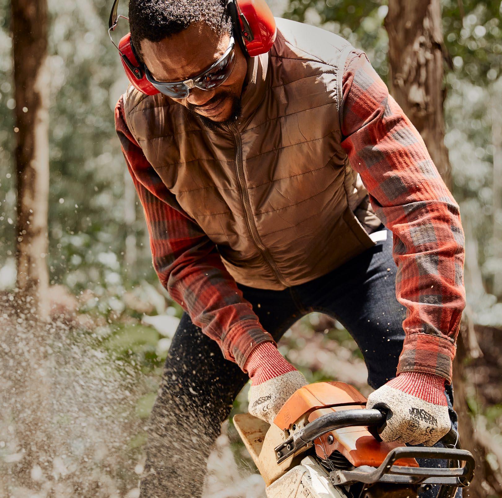 Wandile gets to work in a rust & bark check Herringbone Workshirt, a bark Packable Bodywarmer, denim Men’s Jeans, black Jonnyma Cut 5 Reinforced Nitrasandy Palm Gloves and Raptor Indoor/Outdoor Spectacles.