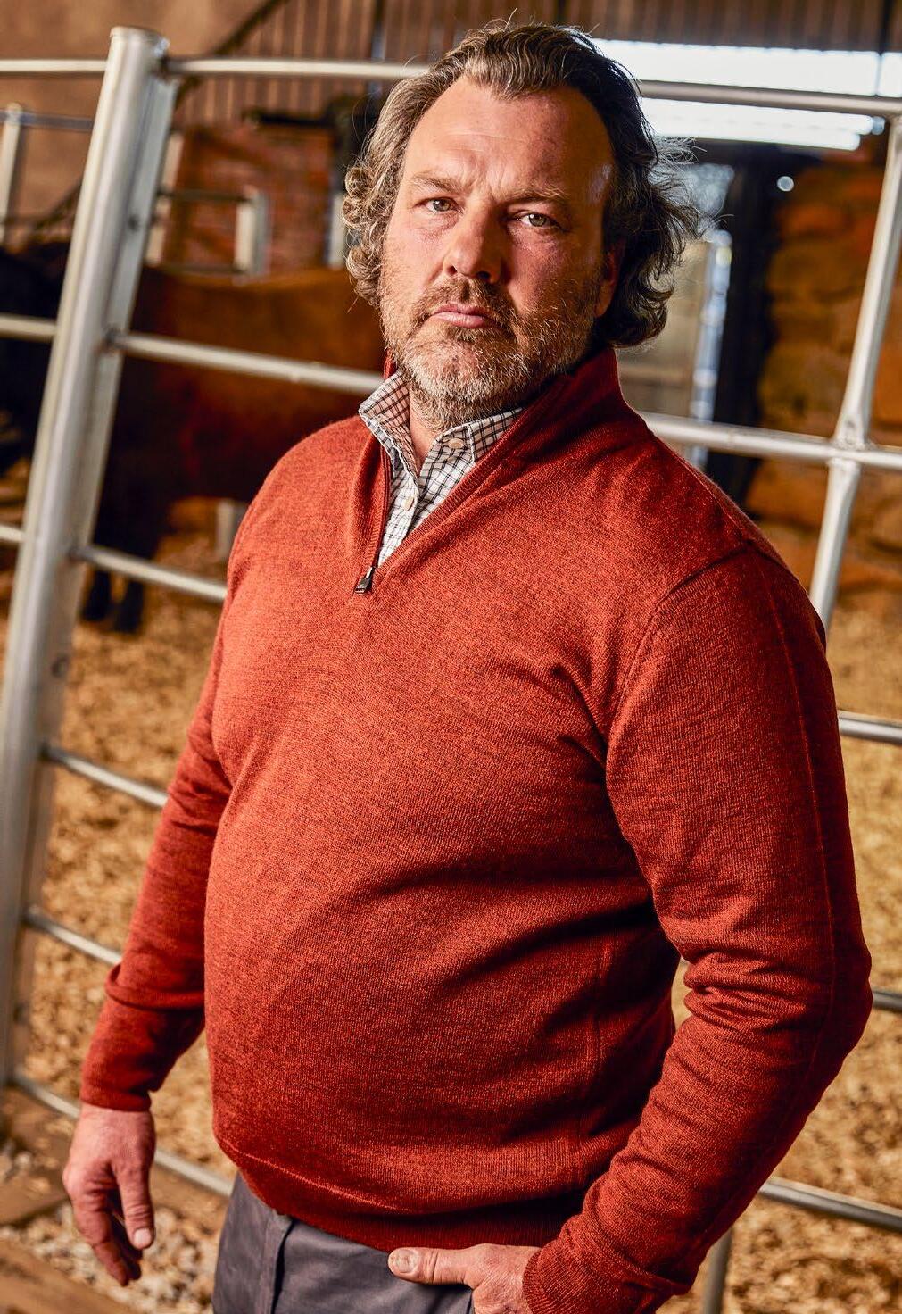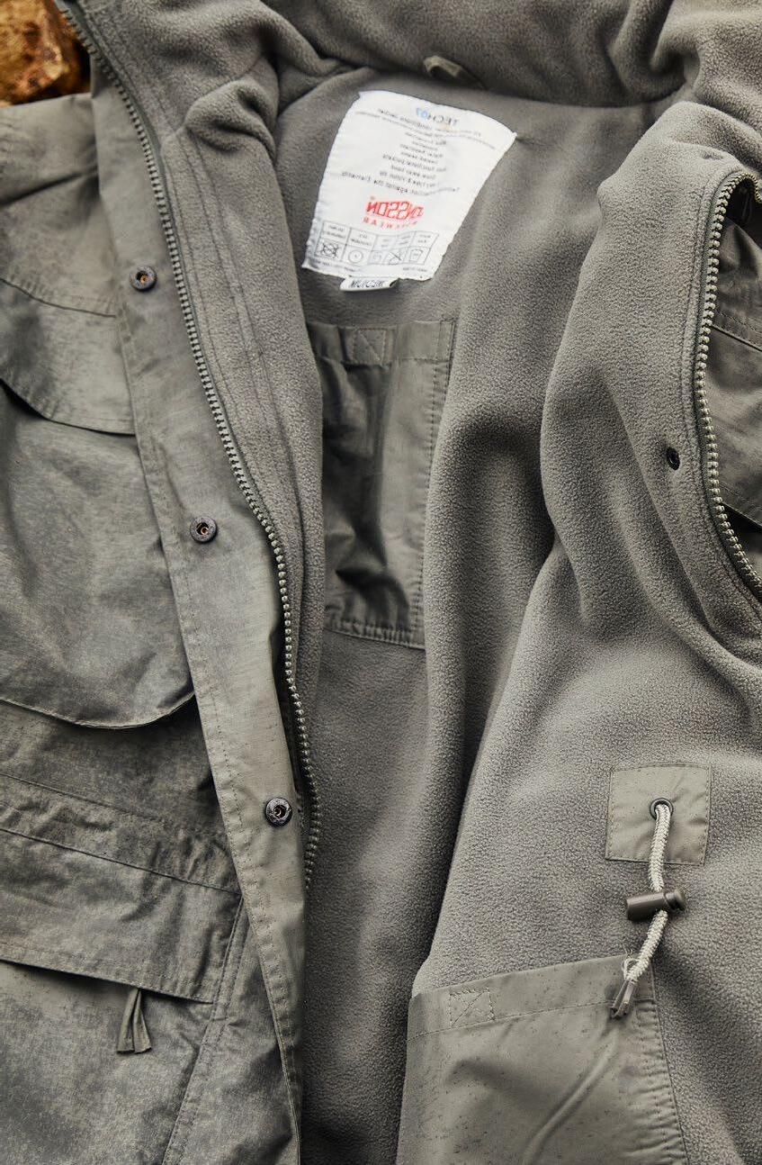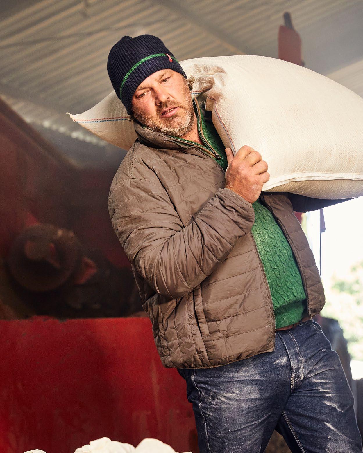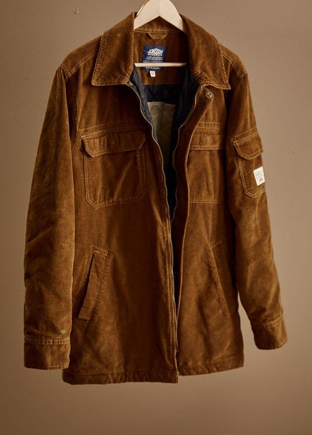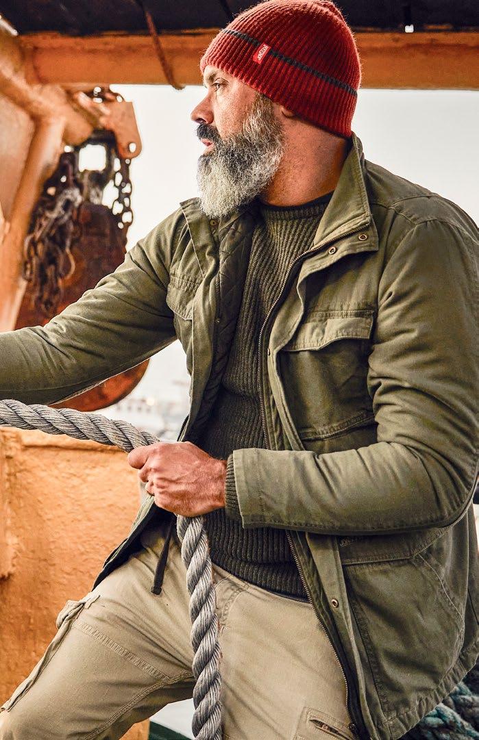 Lee keeps warm in a fatigue Legendary Crew Neck Jersey, a Limited-edition thyme Parka Lined Jacket, paired with khaki Rugged Cargo Pants, a rust Beanie and yellow Cowhide Leather Gloves. Parka Lined Jacket also available in bark and khaki. Parka Lined Jacket in-store May 2023.