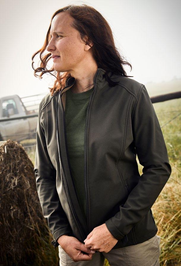 Ane’ wears a putty Women’s Ripstop Cargo Trouser and zips up a grey Softshell Jacket over a olive Women’s Combed Cotton Tee. Softshell Jacket available in various colours.