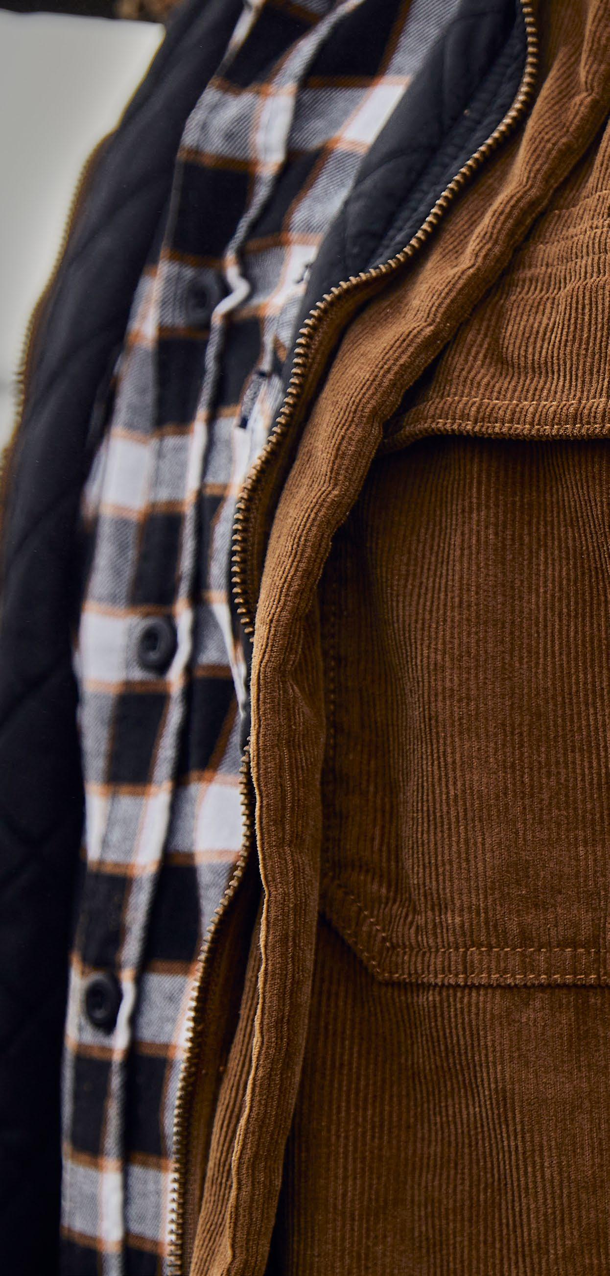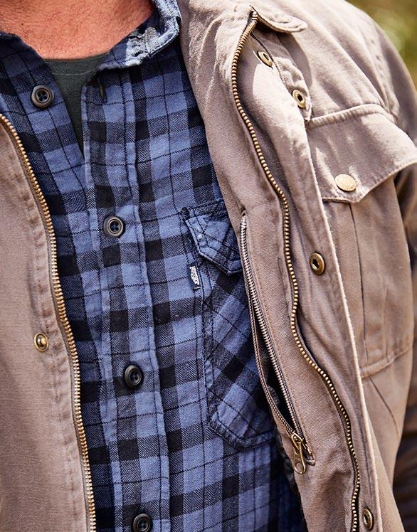 Stay warm by layering a charcoal Mélange Tee under a royal & black check Herringbone Workshirt and a bark Canvas Shirt Jacket.