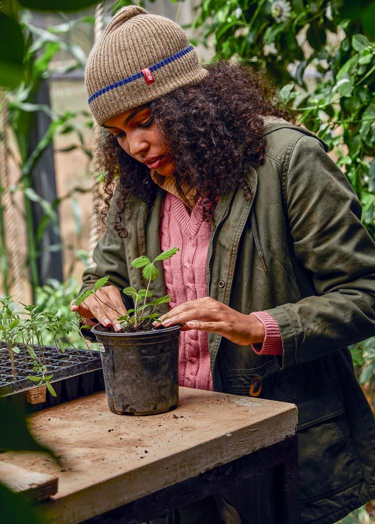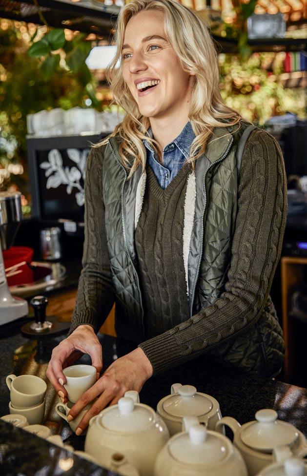 Elizabeth works comfortably in a khaki 100% Cotton Women’s Short Sleeve Shirt, a musk pink Women’s V-neck Jersey, a thyme Parka Ladies Jacket and a khaki mélange & mid blue Tipped Beanie.