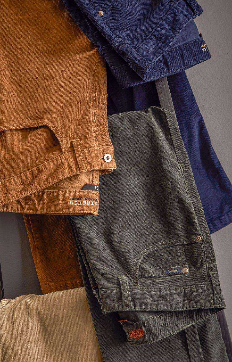 Limited-edition Stretch Corduroy 5 Pocket Trousers available in camel, dark green, light khaki and navy.