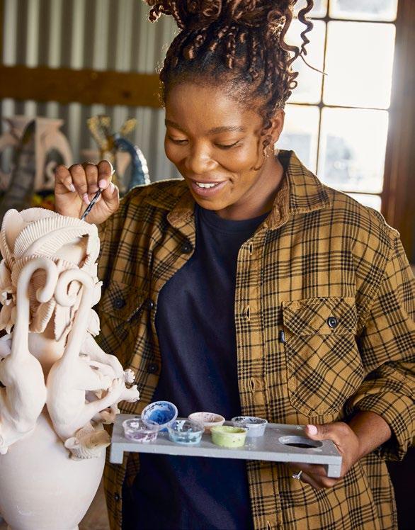 Nontobeko wears a navy Women’s Combed Cotton Tee under a camel & black check Cotton Twill Workshirt.