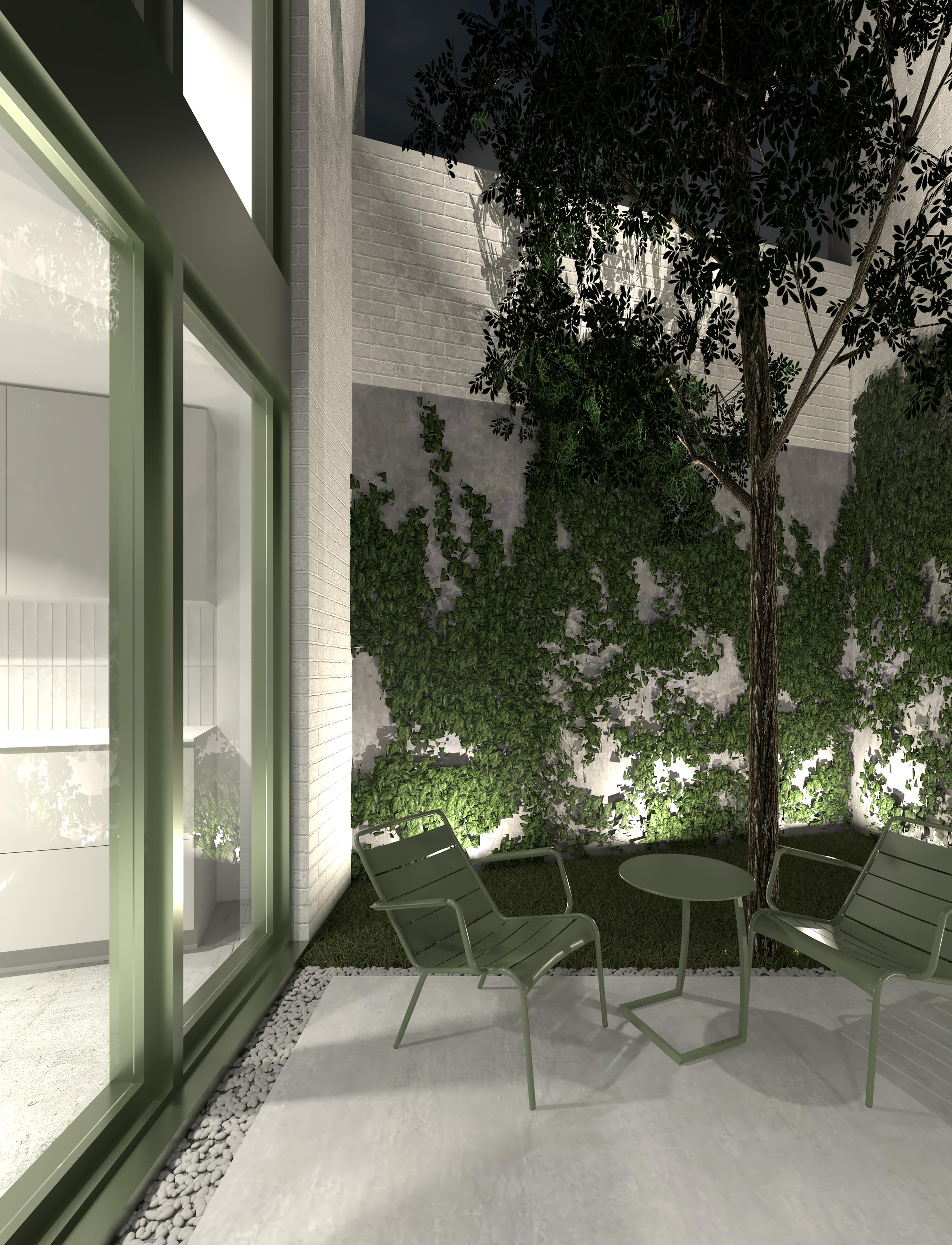 La taille restreinte du terrain nous pousse à l’utiliser sur toute sa surface, empêchant ainsi toute ouverture sur les murs mitoyens. C’est donc par le coeur que deux puits sont créés afin de permettre à tous les logements de s’ouvrir sur l’extérieur et d’apporter une lumière généreuse. Au pied de ces deux puits, une cour intérieure avec un arbre central permet aux logements un accès intime à un espace extérieur ; au sommet, la cime de l’arbre apporte un lien avec la nature aux logements supérieurs.