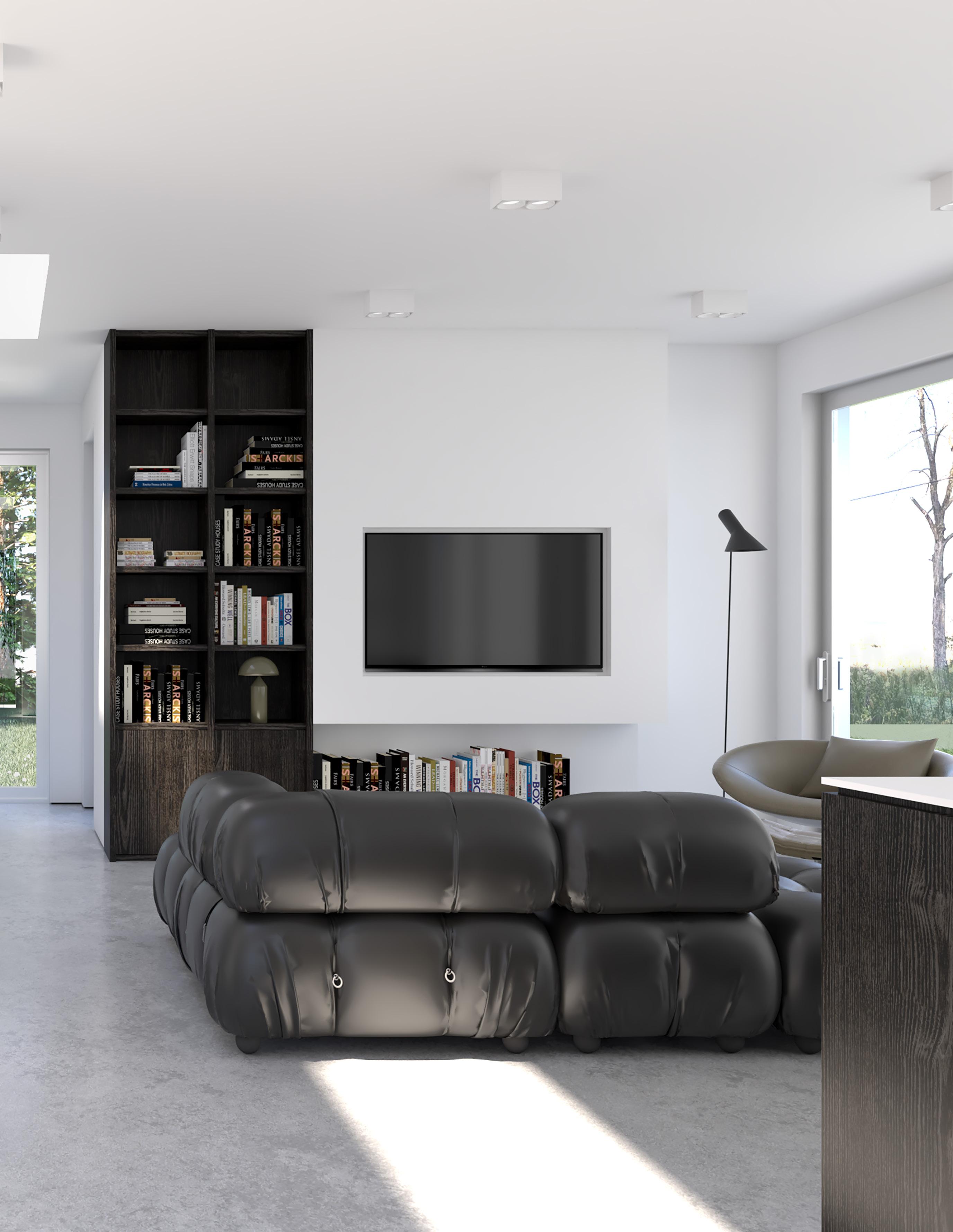 L’aménagement actuel est conservé et ajusté afin d’y intégrer des rangements au niveau de la cuisine et de l’aire de vie, notamment pour des livres. Le béton, déjà présent au sol et au plafond, est repris au mur afin de compléter et d’uniformiser visuellement l’enveloppe du condo. La distinction entre murs, sol et plafond tend donc à se dissiper et contribue à oublier la taille restreinte de l’espace.