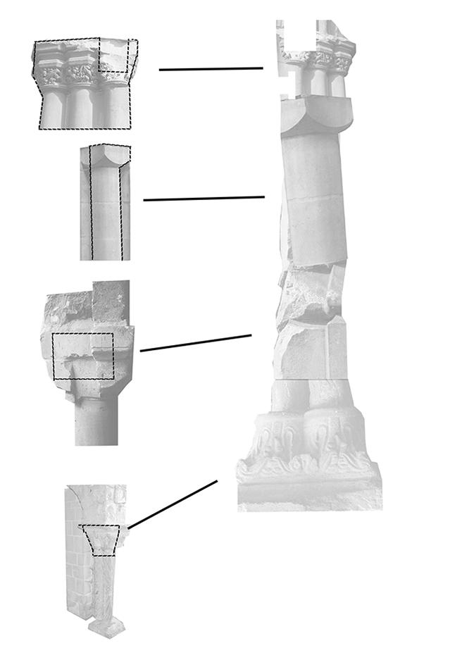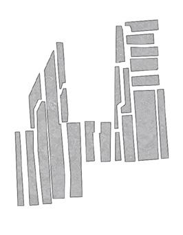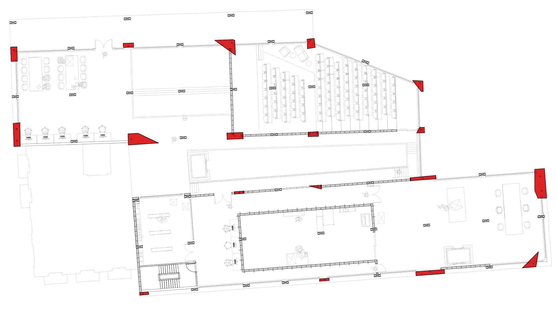 The plan for the 18 columns was developed by overlaying all the site’s historic massings onto the current floor plan. From this overlay, 18 distinct shapes were extracted. These shapes form the uniformed column plans for all floors, as seen below By removing the area of the current floor plate from the overlay, the remaining portions of the historic outlines were divided into 18 forms. Each form became the elevation/vertical form for a column, maintaining its plan shape across floors but varying in elevation according to the remaining historic outlines left in each floor plans overlay.