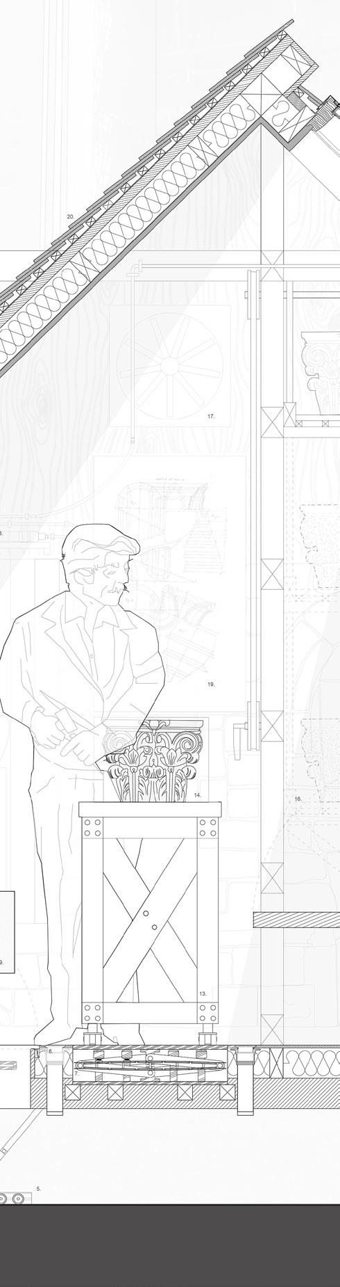 Large auditorium space for formal lectures and conferences. 7. Public assessable physical and digital library that includes the work and archive within the building. 8. Gallery holding temporary storage of artefacts for public viewing to see the work on hold. 9. Informal conference space and relaxation area with more open natural lighting and informal seating 10. Classroom and workshop space focusing on education and teaching restoration to the uni students. 11. Adaptable event space with revolving door slides and exterior access with a quiet space.