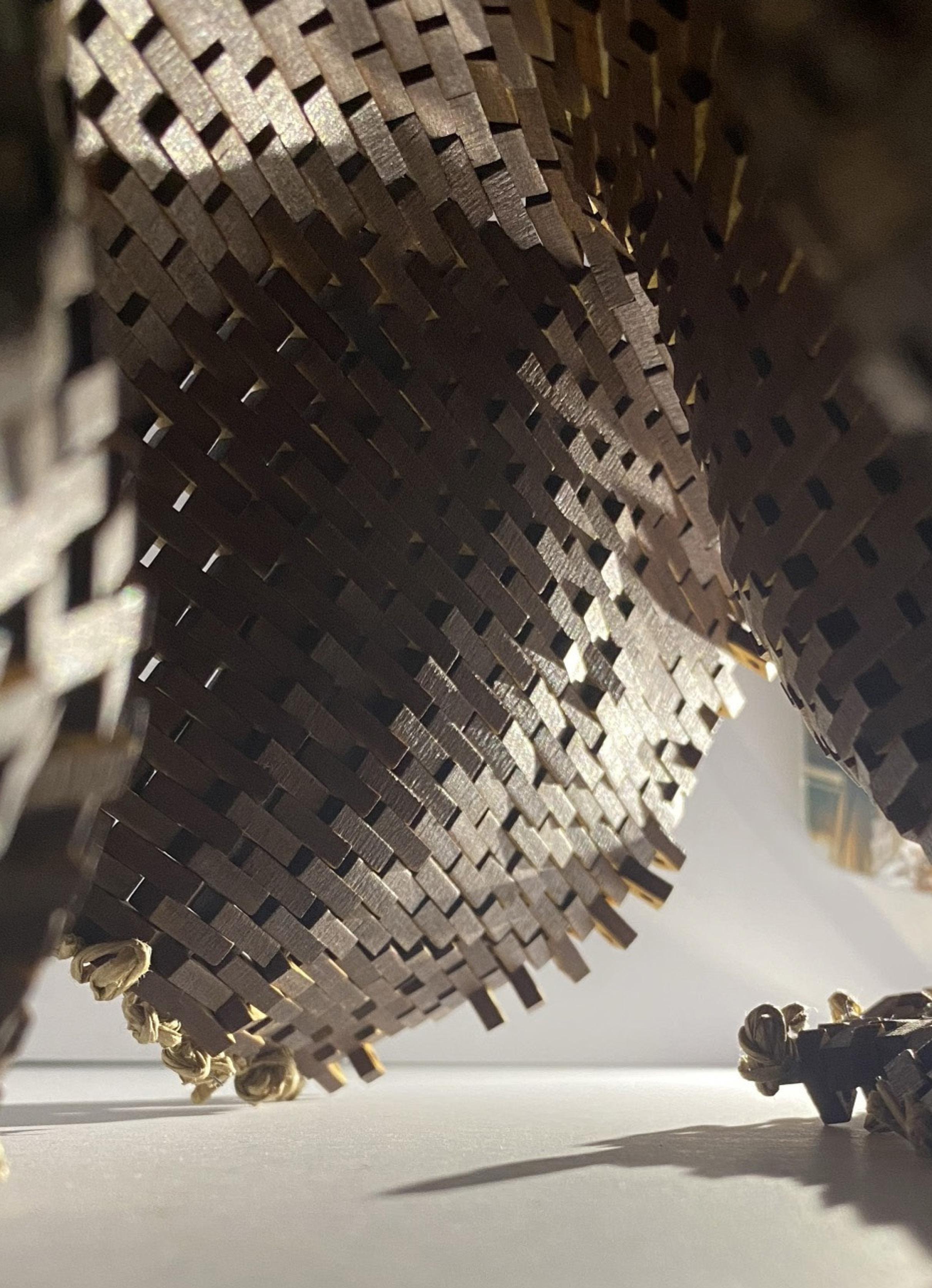 shape, allowing a structure to stand independently while in a constituted thin material. As well as taking inspiration from the Folly For A Flyover and its bead curtain design. My proposal acted to respond in a similar manner by responding to the site’s distinctive brick composition, I explored experimenting with transforming typically solid material forms into organic shapes in contrast to how they are typically perceived. My aim was to capture both the structured brick patterning of the landscape and the natural curvature shaped by its topography. I used lightweight timber bricks with a flexible rope joint system and integrated metal pipes at key points in place of rope, allowing both anchored and free-standing configurations, which evolved into a sitting pavilion with the key focus on temporary and recyclable structural composition.