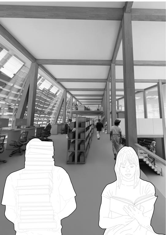 Third Floor - The library a core space comprised of curated digital and physical collections for nearby universities. Adjacent site the upper city council department offices and Independent quite study spaces/rooms.