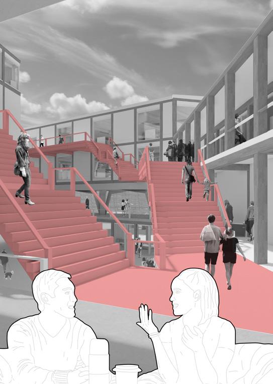 The council’s/civic presence is captured through the city council department departmental and a city document archive that anchor the buildings governmental presence. The community’s/ social identity is reflected in the public spaces integrated both within and outside of the building, which include pop-up market areas, communal speaking spaces, a public library, and study areas, unified by an elevated red pathway which acts as the main connection point.