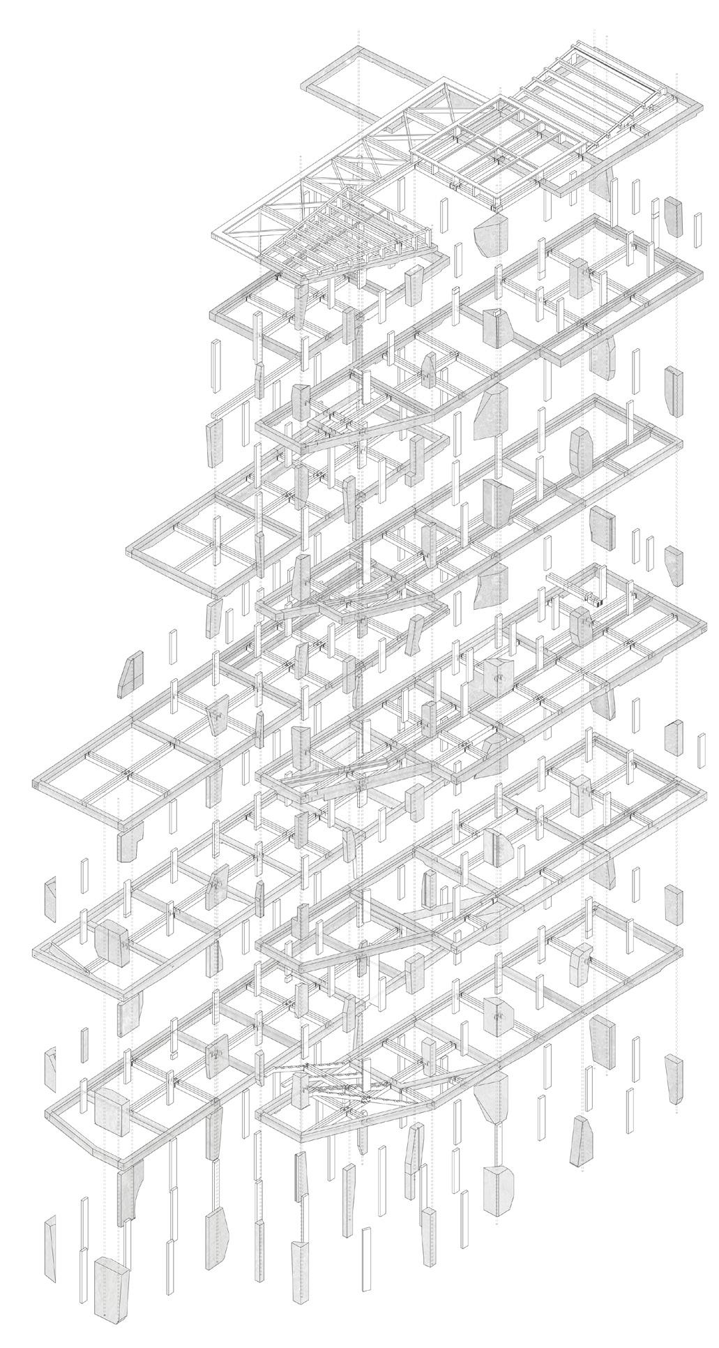 The stone structure is composed of 18 vertical columns which run through the building. This runs in combination with the floor framework which outlines each floors massing hinting to the sites massing floorplates as discussed on the previous page.