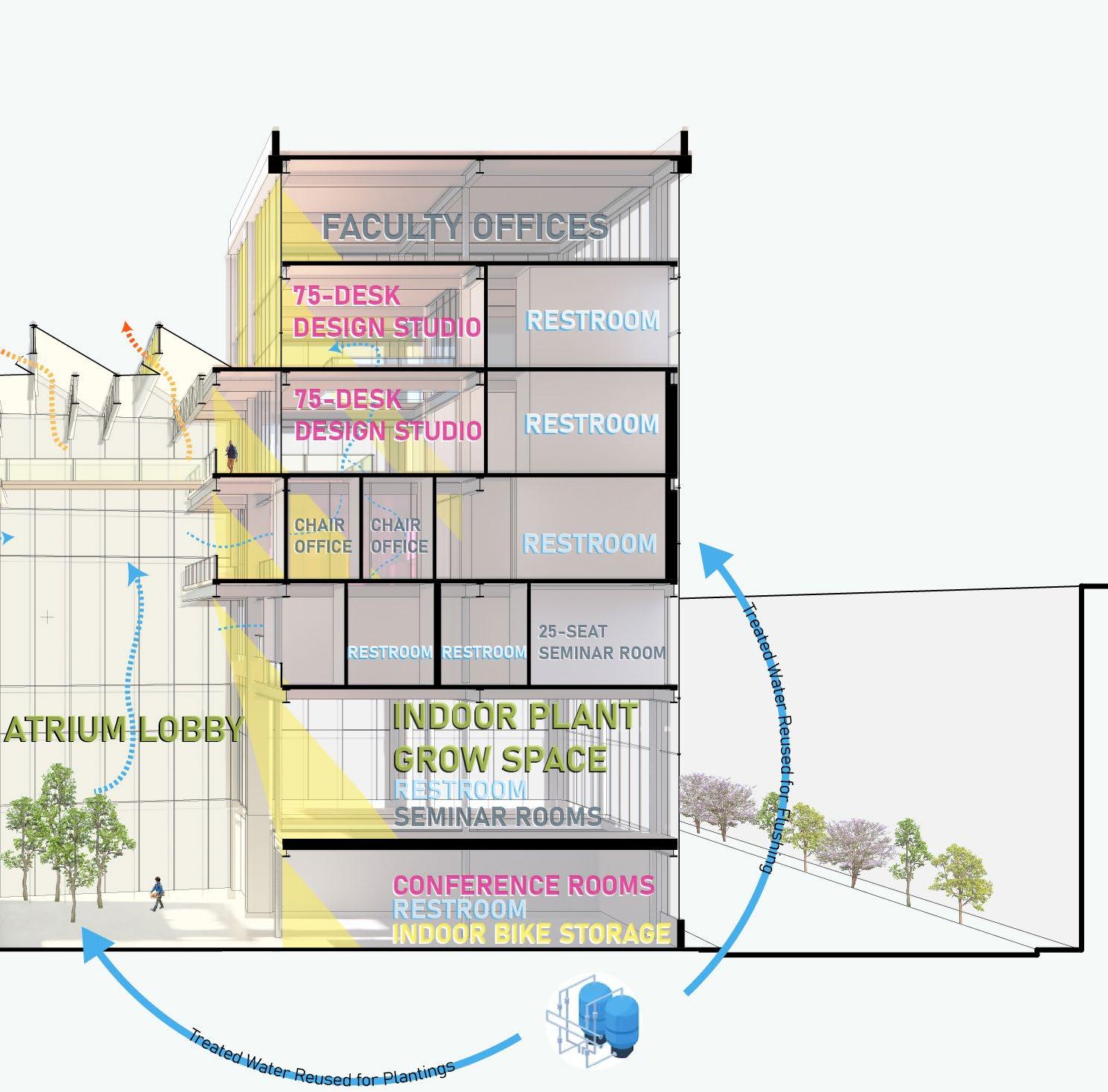 Through the use of stormwater retention, grey water filtration through rooftop garden spaces, and the careful practice of water conservation, the Greenhouse can distribute “one water” throughout the building. The use of this type of hydrological cycle allows for a minimized water consumption, while also mitigating environmental impacts on the local water table.