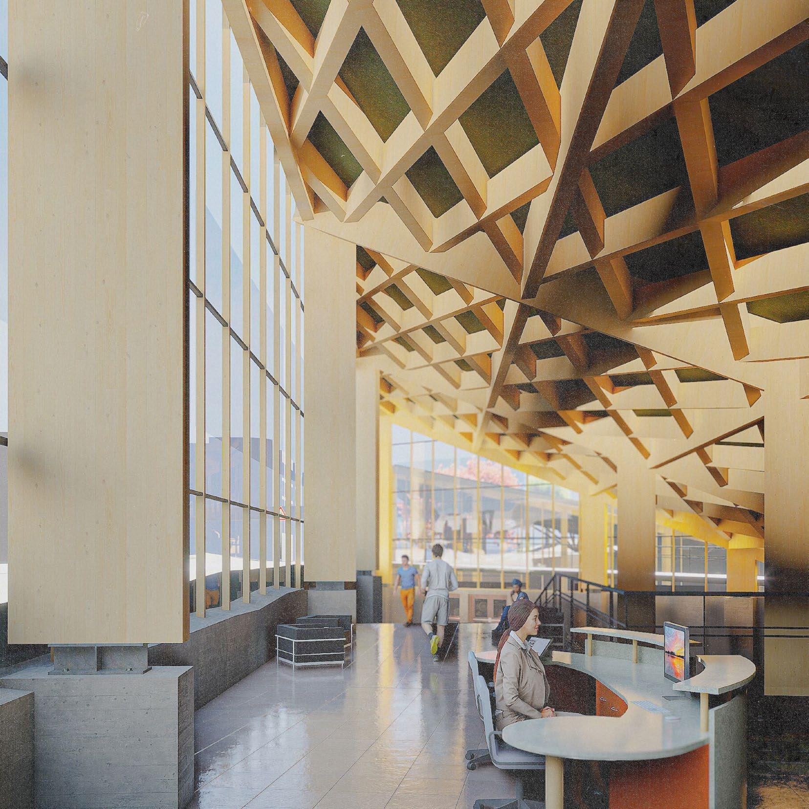 Use of zipper truss and glulam diagrid structures allow appopriate spanning capabilities for program distribution.