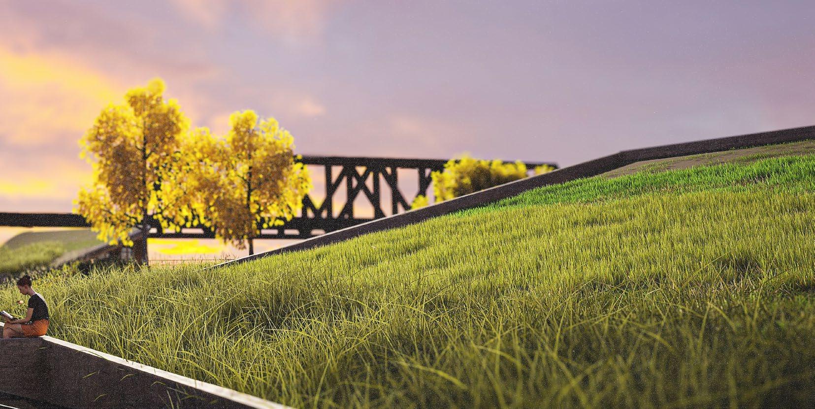 The roof design collects and filters rainwater before returning it to the river, reducing runoff impact and promoting responsible water management.