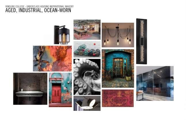 The Interior Design of our previous residence hall project, Bridge Hall, was greatly influenced by the nature of the building site and its surrounding habitat. Imagery of palm trees informed the selection of a bright green color palette and material patterns reminiscent of angled palm fronds. While palm trees and live oaks are abundant on Ringling’s campus, the Floridian ecosystem includes a plethora of natural beauty. I searched for new inspirational imagery of coastal Florida such as the bayou and mangroves that drape the borders between land and water. I often though about organic branching patterns, layers, and how inlets and bayous transition to deeper, open water. My vision boards included photos of oceanscapes, waves, and underwater snapshots that one might find off the Floridan shores that depict vibrant, deep hues and natural layers.