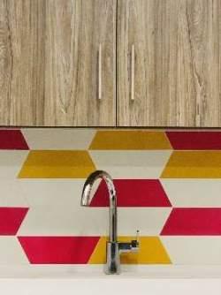 Once the angular patterns took root in the main lobby, it expanded throughout the building in the form of angled bulkheads down the corridors, the faceted carpet and LVT tile in public spaces, and the hexagonal backsplashes in the apartment kitchens.