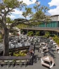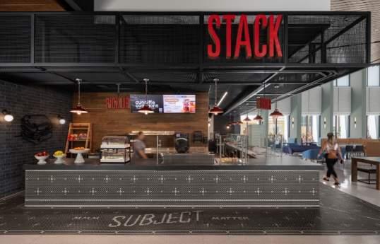 Our goal with Cunniffe Commons was to diverge from the traditional cafeteria design of the past and create the experience of an urban food hall, a popular dining trend in American cities in recent years. The footprint of the building angles and pivots around existing grand trees asking students to meander throughout this dining hall. With a nonlinear path, the experience becomes diverse from sight to sound and even smell. The placement of dining platforms is intentionally “scattered” across the plan. While one end of the dining hall is open with high ceilings, surrounded by natural light, brighter finishes, greater access to Digital media/audio, and various seating groups that encourage social interactions, the other end of the space is cozier and tucked away for peaceful, solo dining. In addition to various locations, each platform has their own unique design and branding creating a neighborhood of various micro restaurants. Just as Ringling students create new art every day, they also create their own dining experience each day at Cunniffe Commons.