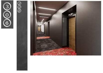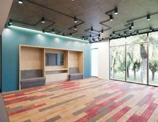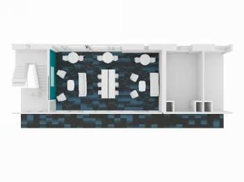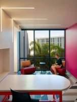 The Underclass Housing has a series of repeating residential spaces from level to level. The Interior color palette progresses from the dark navy blues of the ocean floor (the building’s ground level) to warmer violets and pops of bright corals (upper levels). With the desire for a hip, industrial style, accents of ocean-patinaed and dark bronzed metal appear in architectural features from the oxidized metal-look tiles that clad the building lounge booth niches, a perforated elevator lobby ceiling, lounge accent lighting, and even the unit entry sconces. Underclass housing also features blackboards at each unit entry and custom LVT flooring depicting a collage of warm, deconstructed oriental rug motifs for added color and residential style.
