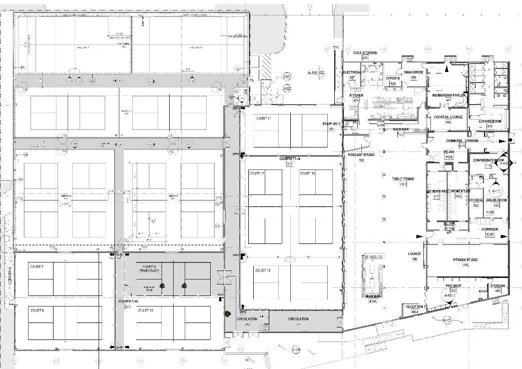 As for athletics, St. Pete Athletic members have access to 14 pickleball courts and 2 padel courts. The client plans to host tournaments and events throughout the year. The remaining 2 existing buildings and the prefabricated metal building house the court space and also provide areas to gather, dine, and spectate courtside.