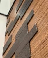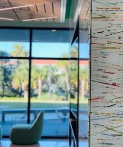 Inspired by the black and white checkered floors of Old-world hotels, I searched for modern-day finishes that delivered the same crisp contrast. A white terrazzo floor and black mullions deliver this concept in our feature lobby. Juxtaposed to our black and white finishes are bold, vibrant colors that appear on each floor. While the first floor debuts a leafy green hue, the second floor is accented by fuchsia and the third floor by aqua. Each floor’s identifying color appears in painted ceilings, apartment entry glass boards, kitchen backsplashes, as well as furniture upholstery. Additionally, I wanted to translate the natural Floridian canopy into the built environment. A natural wood ceiling with angular patterns and fractal shapes was born. In the same way that light appears between palm fronds, I incorporated linear lighting in oblique arrangements. To complete the concept, above the wooden “fronds”, there is the surprise of a green painted ceiling.