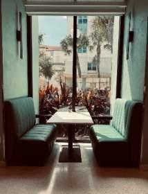 Classic arched bi-folding shutters frame members views from a lounge to the main event pickleball arena. The lounge also incorporates stateof-the-art monitors and projections screens for instant replay and other televised sporting events. The back of the space includes a podcast studio and a smaller breakfast and smoothie bar adorned in coral ceramic tile, deco-patterned marble-look floor tiles, vintage tropical wall murals, custom arched shelving and signage, as well as a blonde wooden tiled backsplash coordinating the palette of each distinct zone to the blonde LVT flooring throughout the space.