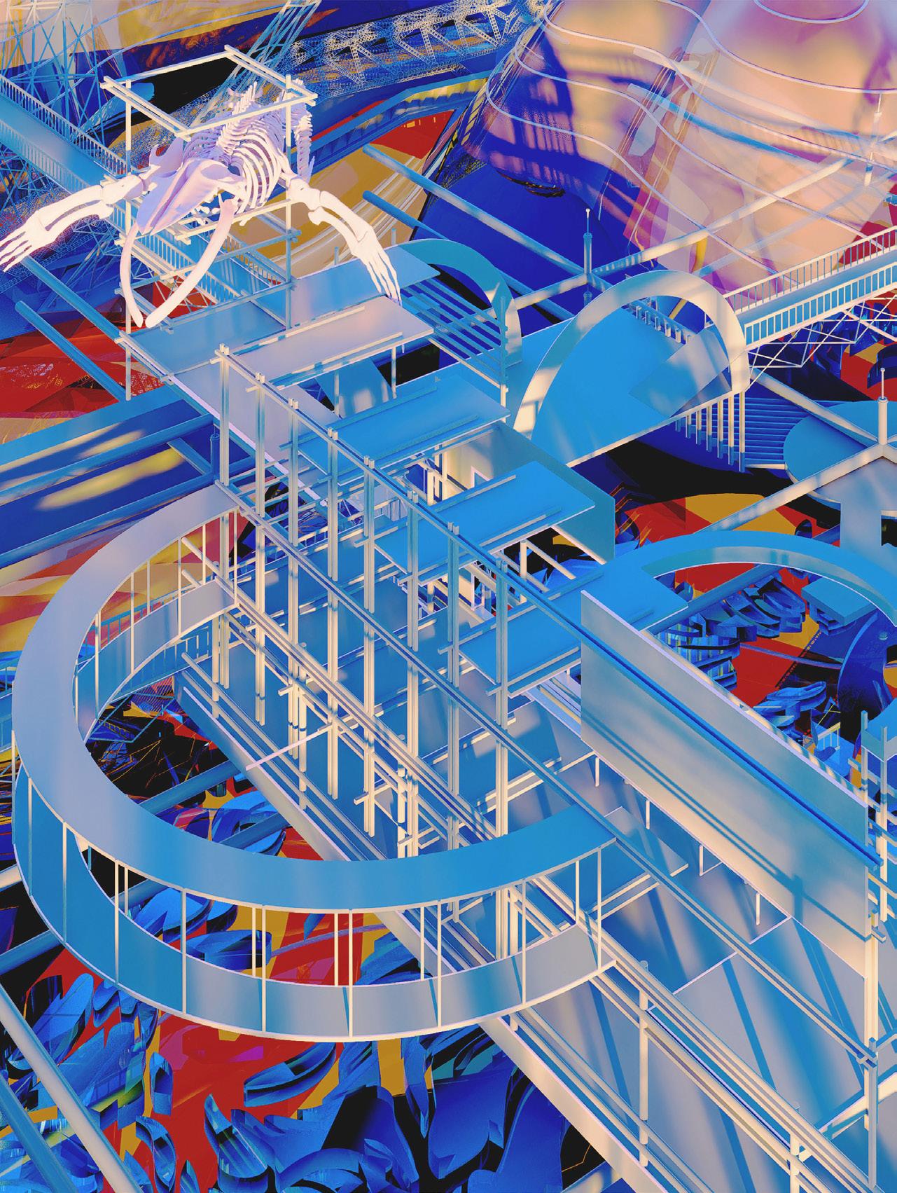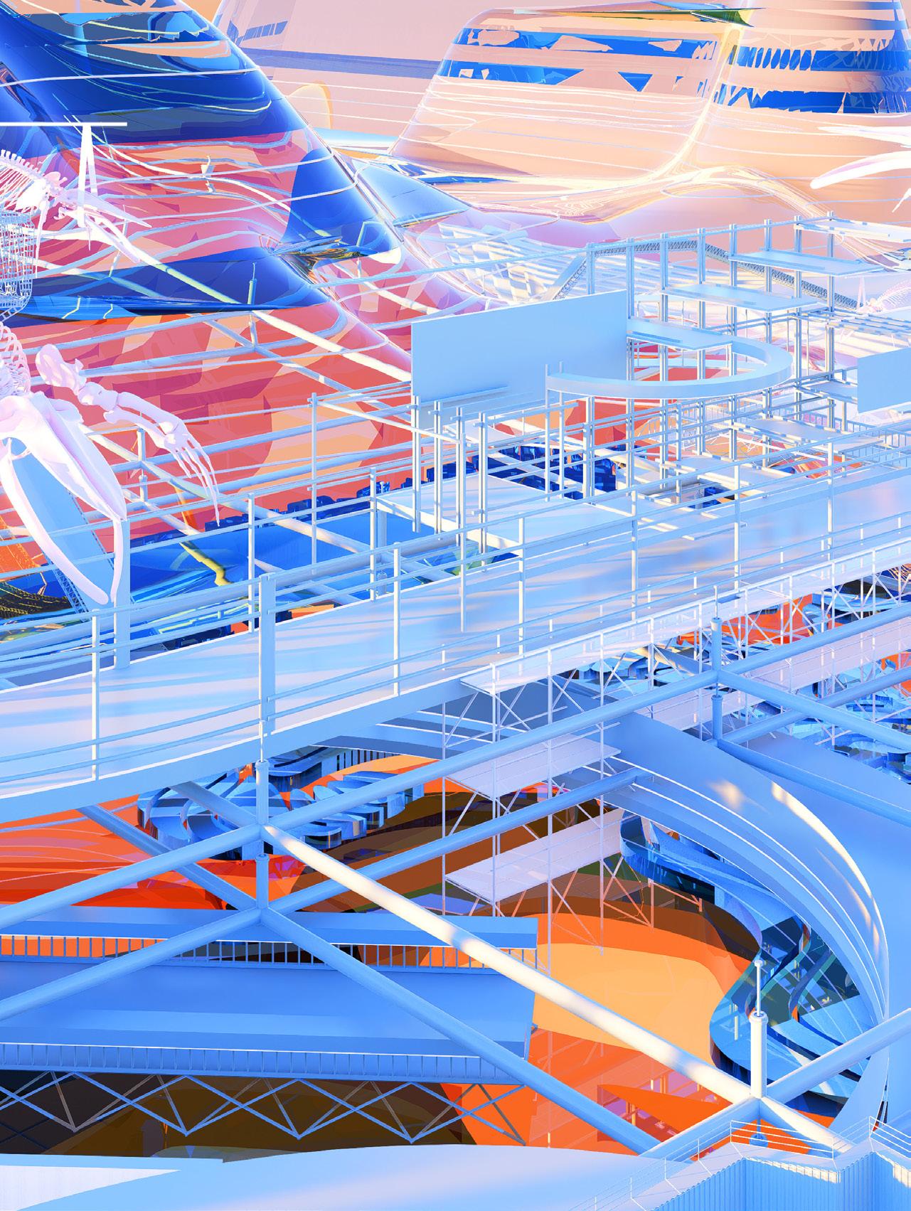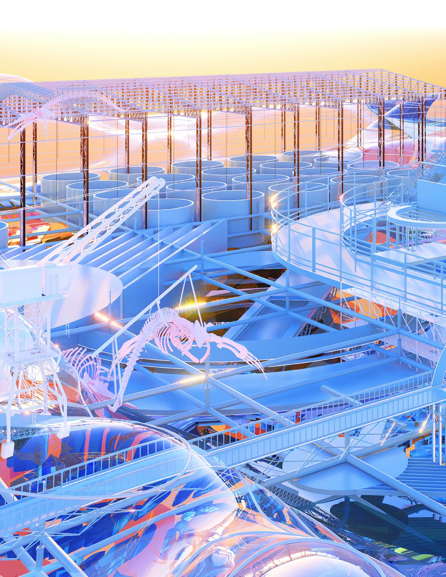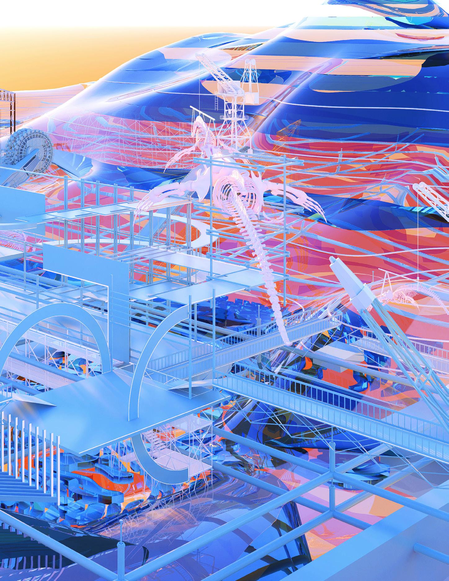 I could imagine an excavation site taking place within the synthetic desert. Between the slopes, the choreography of machines excavate remnants of whale bones for the ritualistic feast. Suspended abattoirs render protein from engineered fauna, while vapor farms siphon the last traces of moisture to add water for the fish hatcheries. A network of scaffolding carries the refined remains of these extractions upward, like offerings to the gods of decay and obsolescence. All of these food production leads to celestial offerings to the mythological gods above. What little remains is not waste but residue, a monument to consumption suspended in time.
