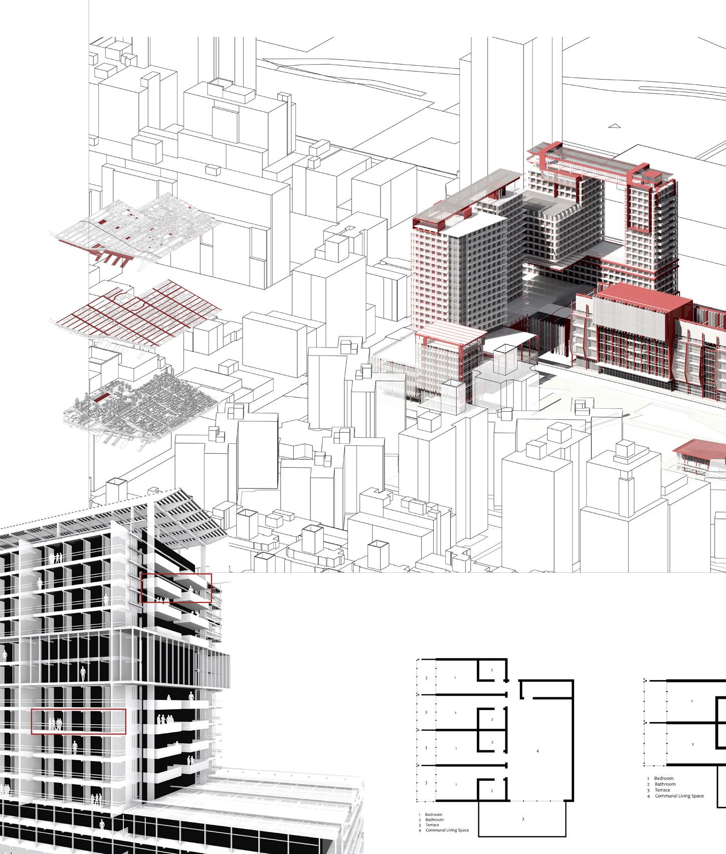 The public programs predominantly occupy the ground floor, fostering urban engagement with diverse retail, coworking spaces, and a venue/bar, enhancing the appeal of Beacon Park and its local businesses. With parking situated above, the upper levels are devoted to residential spaces, ingeniously incorporating semi-private amenities for residents.