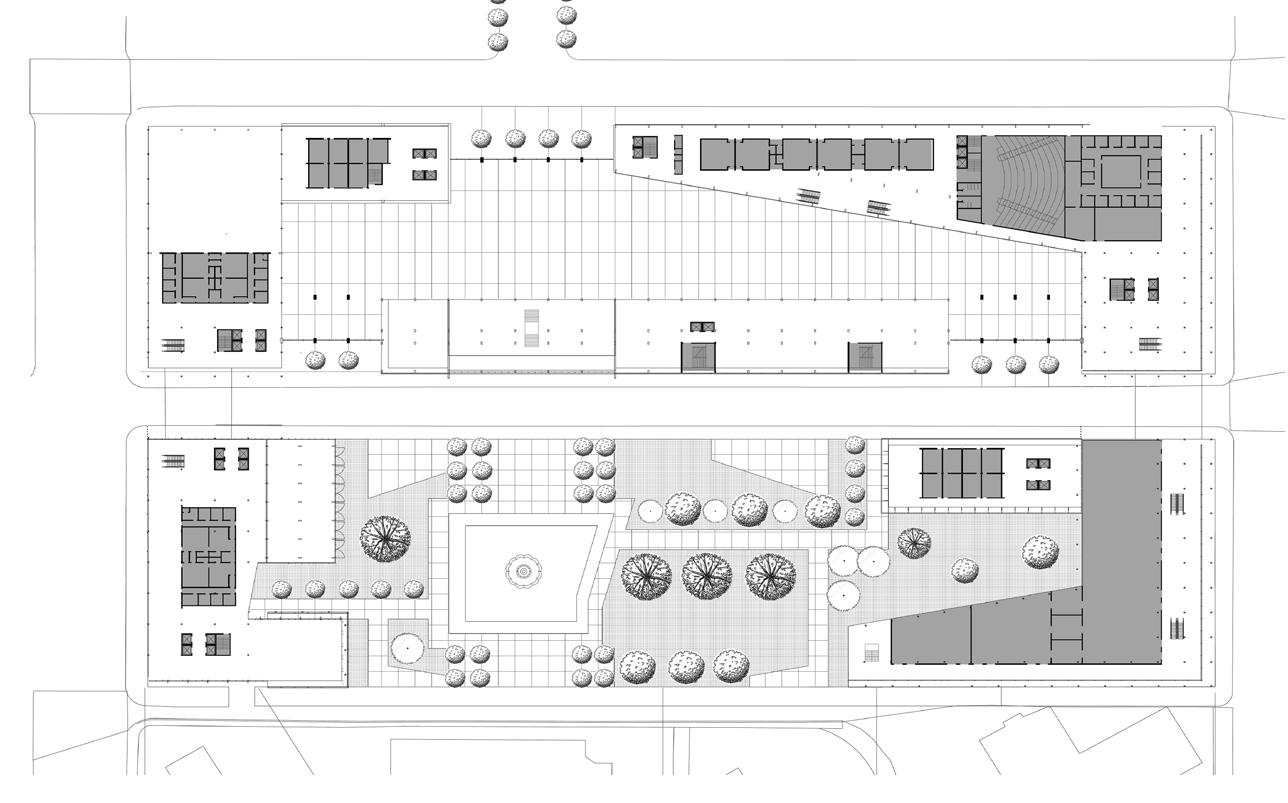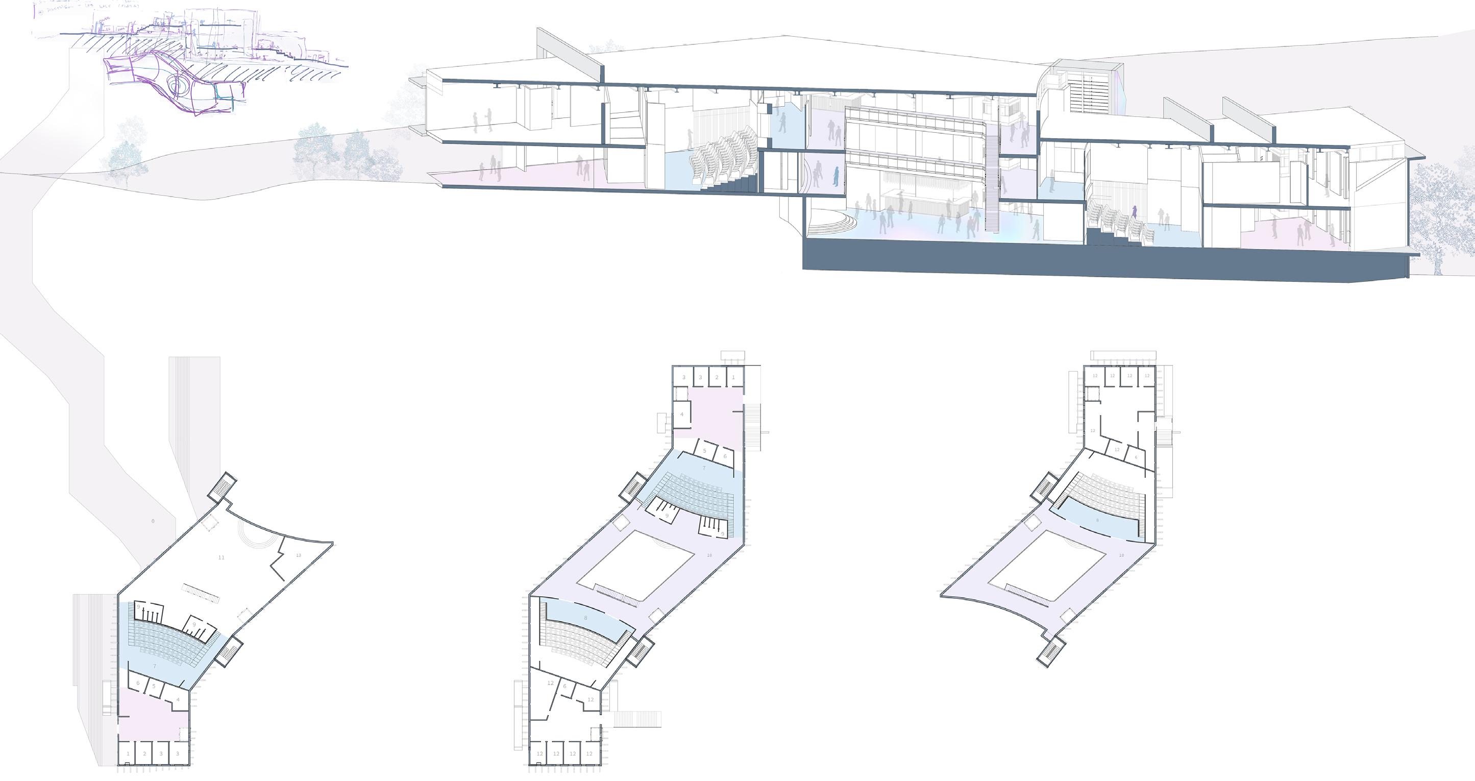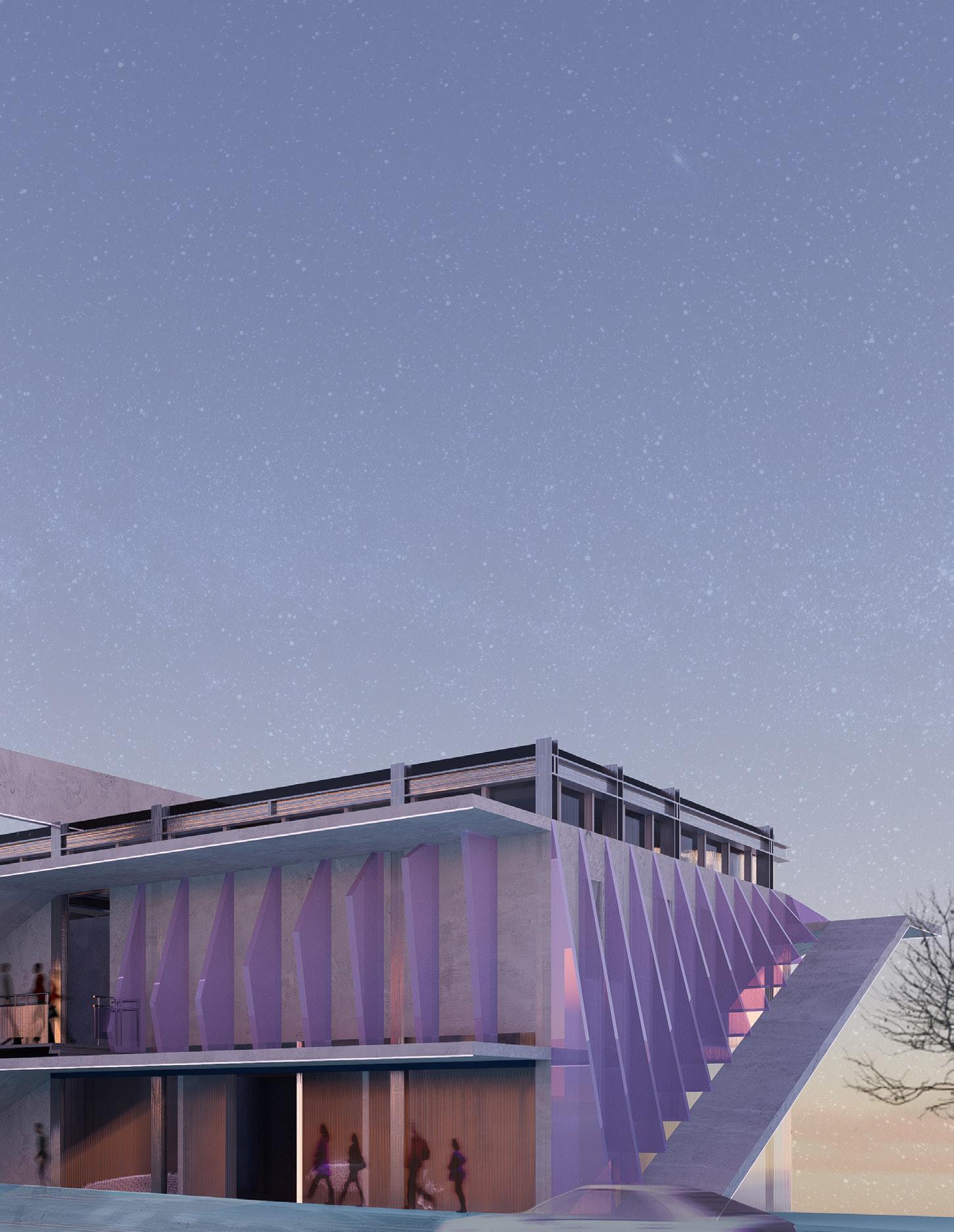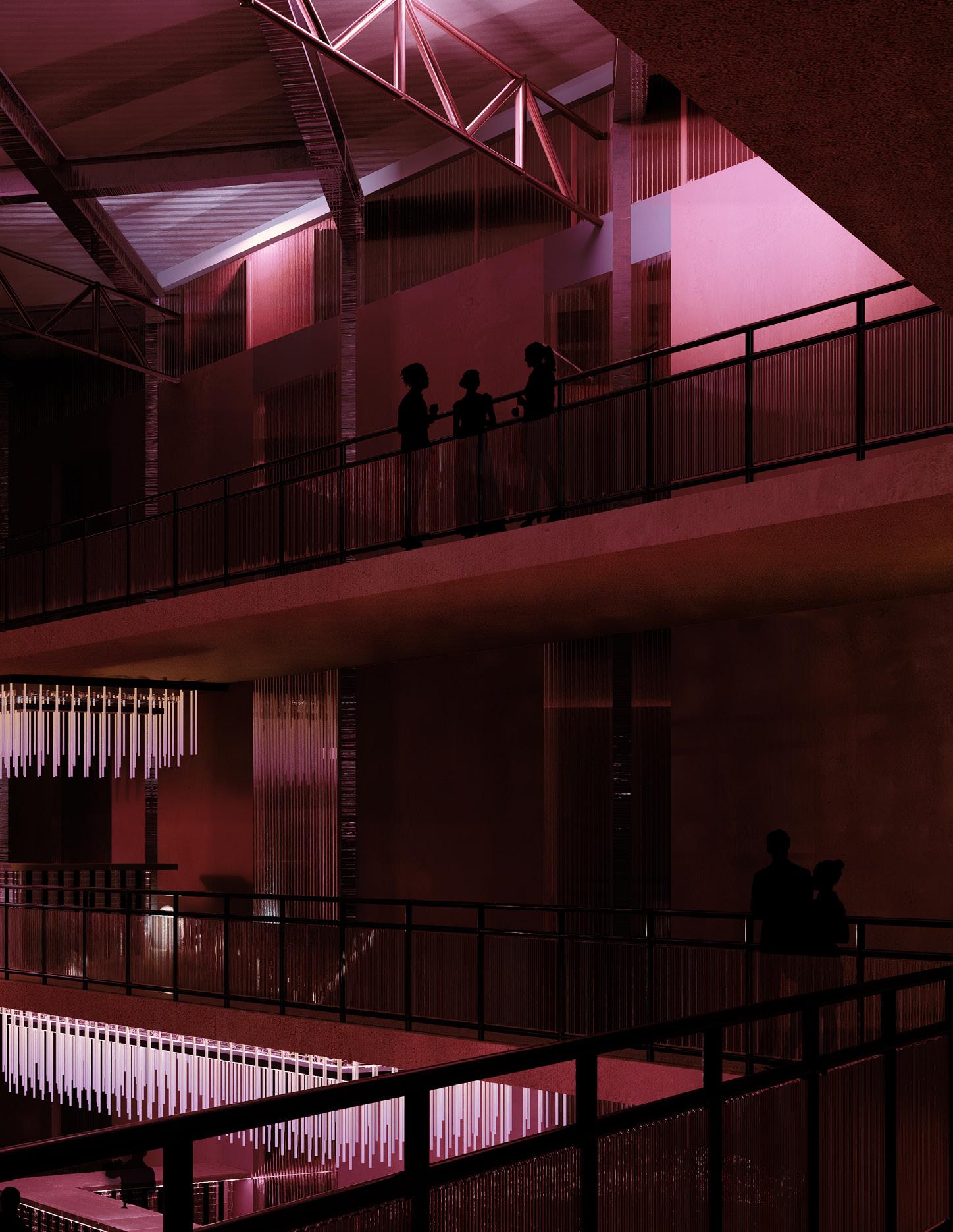 After the film ends, an atrium serves as the threshold, linking the theaters to a three-story dance club. Here, patrons have the chance to transition from the cinematic experience to a lively dance floor. The setting not only allows for dancing, but also provides a space for debriefing and discussing the movie. This enables individuals to extend their social interactions beyond the cinematic realm and have conversations with strangers