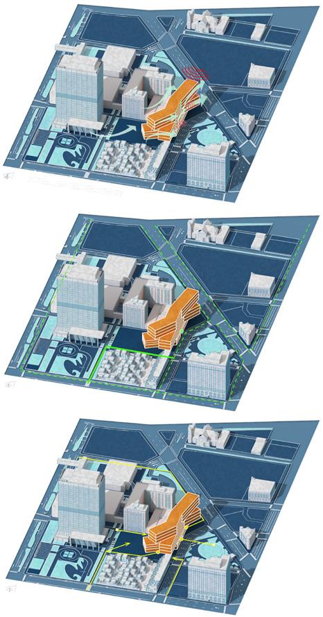 Winds from waterfront flow along the branched massing in different directions, mitigating wind tunnel effects