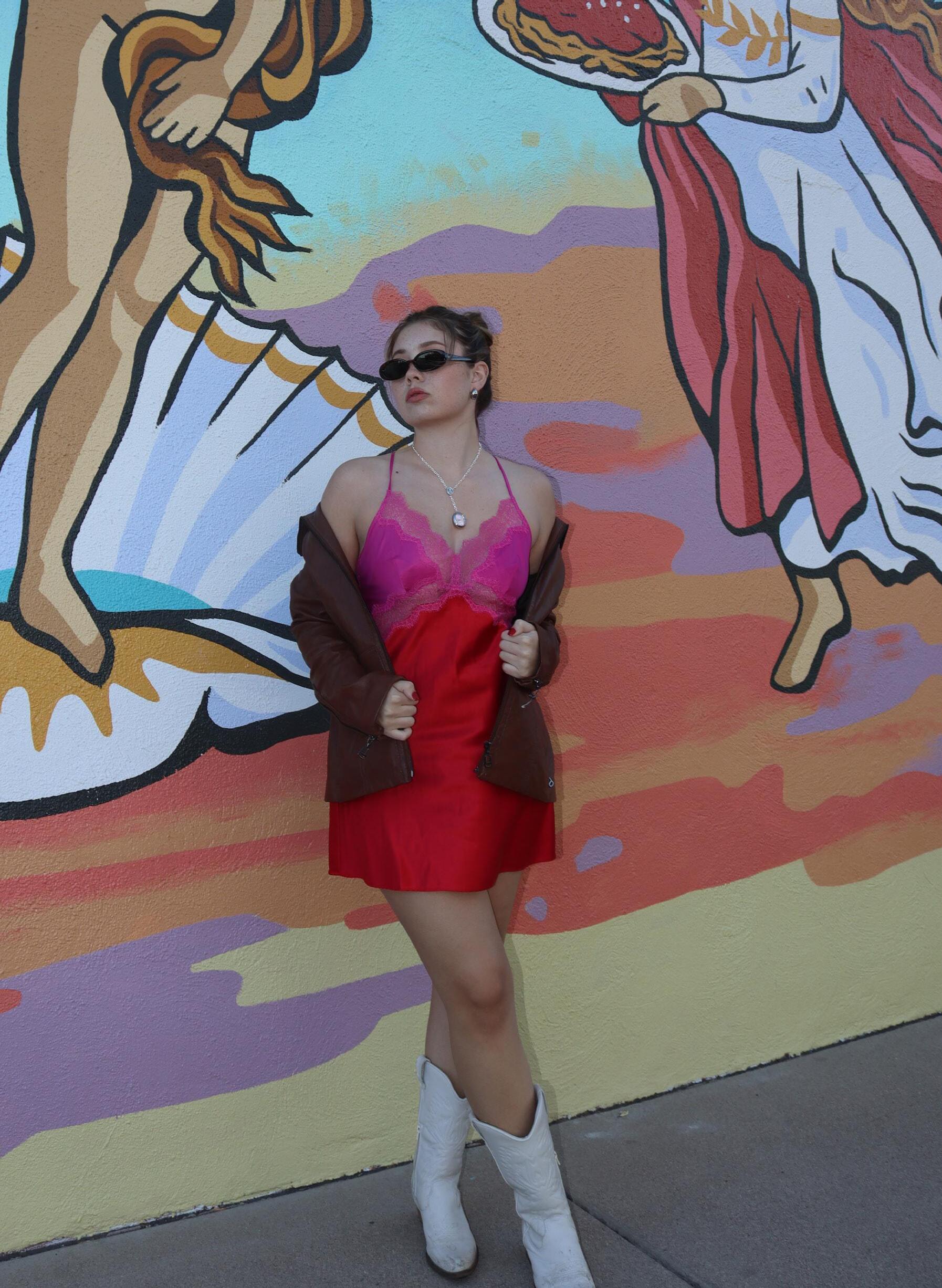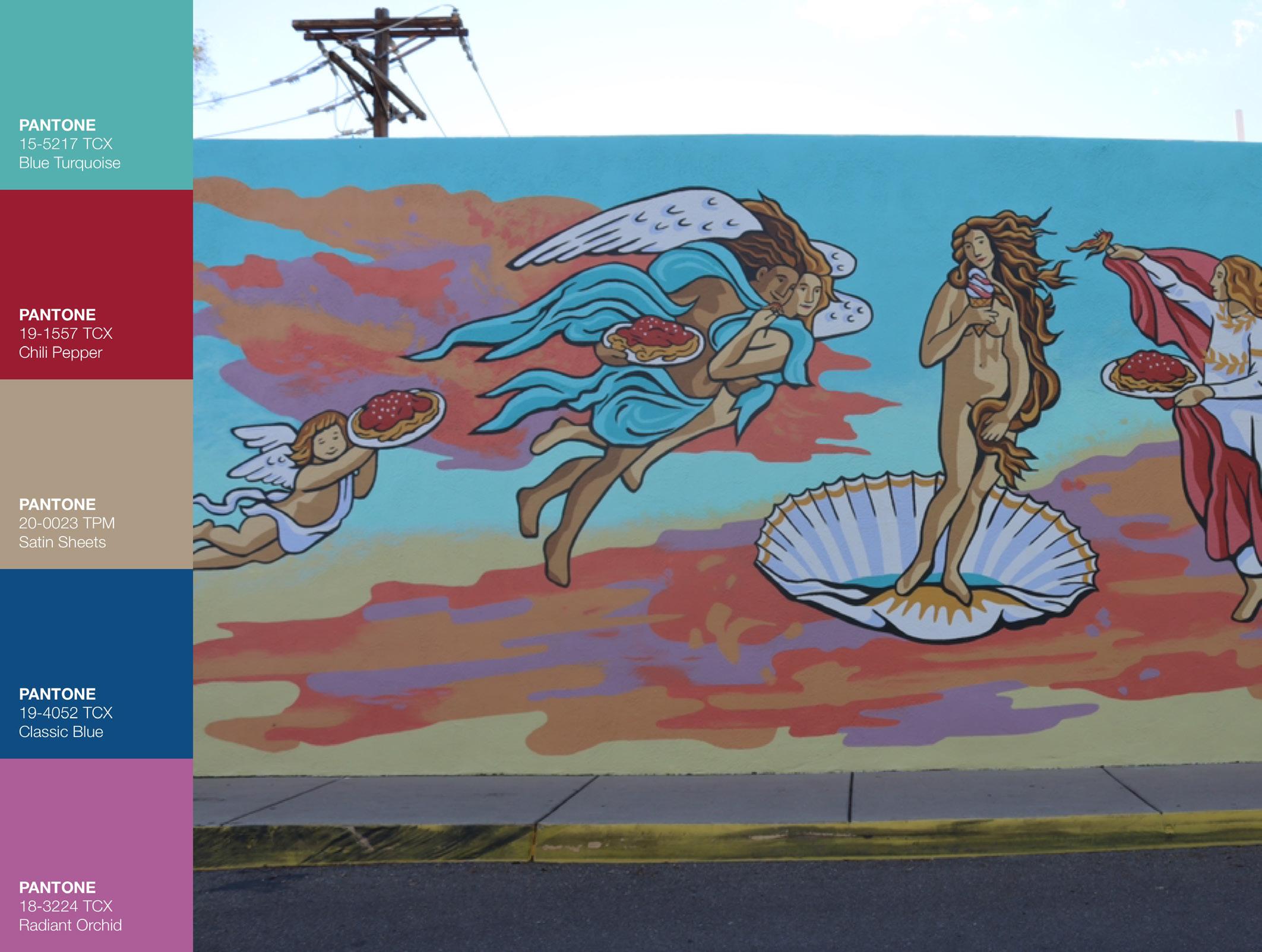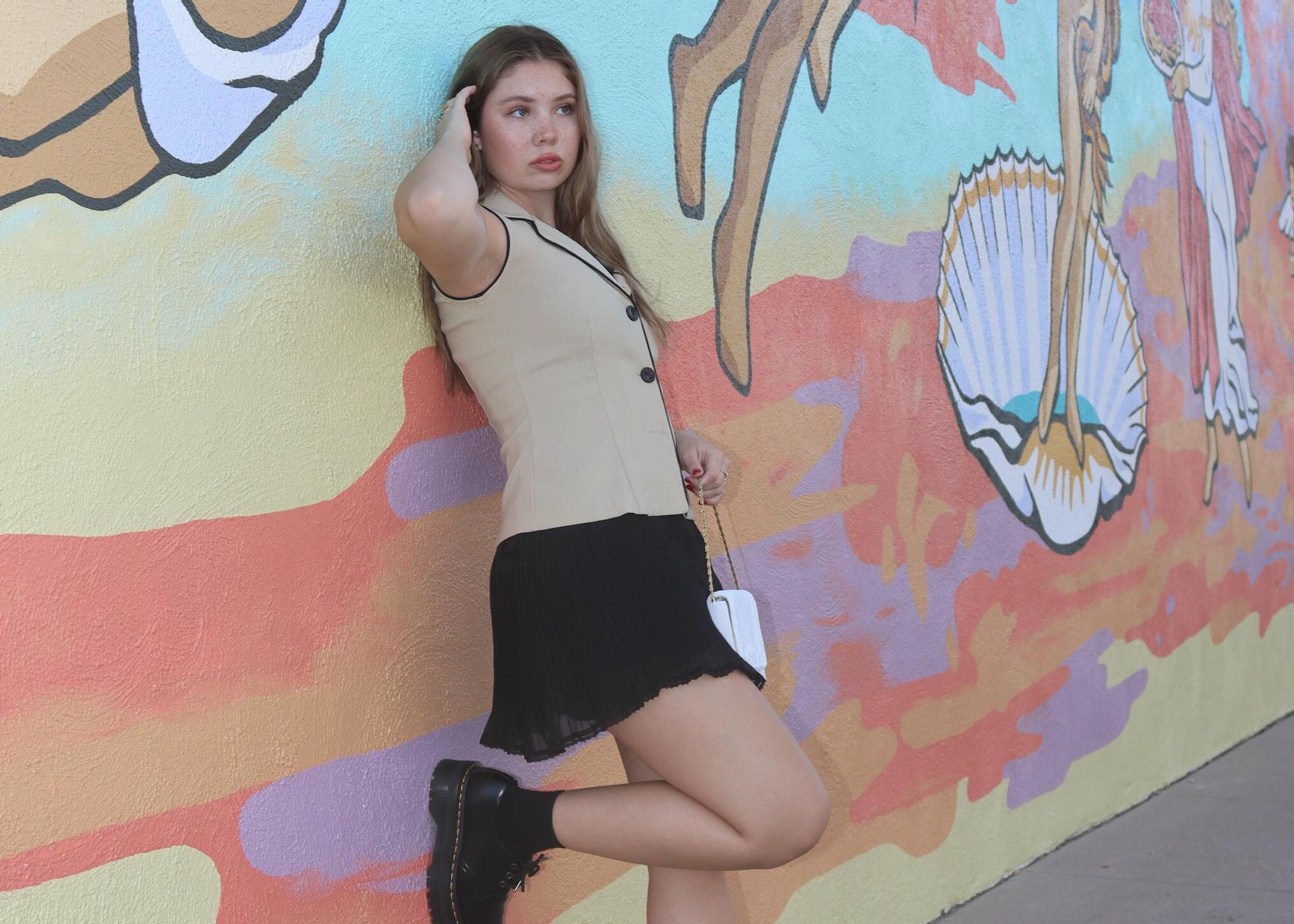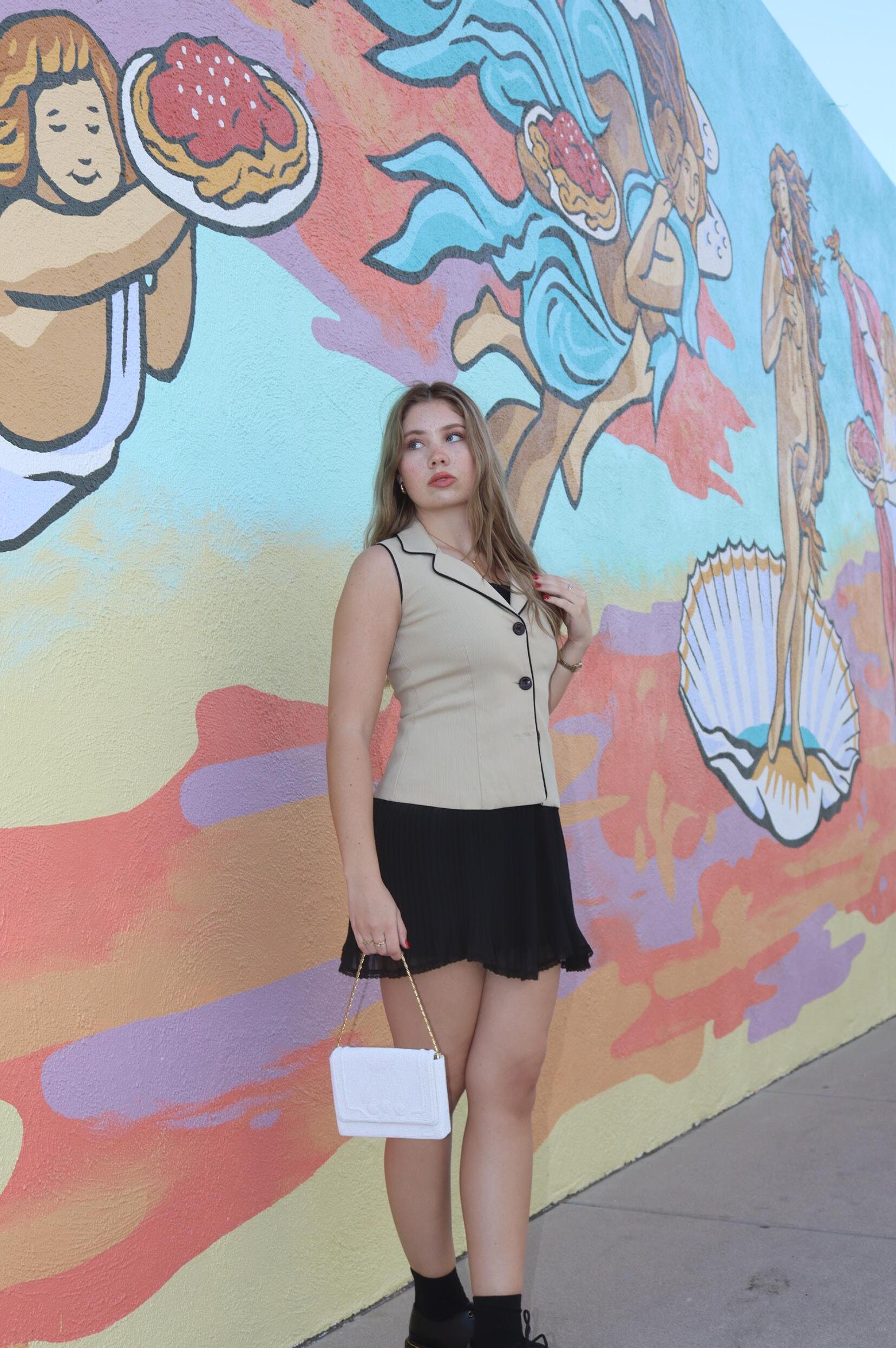As a whole, my Look Book is inspired by the Duality of the Noodies Mural. Originally inspired by the classic “Birth of Venus” painting, Jenna Tomasello took her own creative spin by adding elements of Italian cuisine served in the restaurant. Although this mural is viewed by many as a fun, silly take of the famous Renaissance art, I see it as much more. It symbolizes the importance of embracing yourself fully and being yourself unapologetically, especially as a woman in today’s society. The “Birth of Venus” part of the mural shows the more widely accepted part of women, their physical beauty. People can view women as only ‘pretty things’ without a mind, a soul, or a heart. But women are so much more than that! They are fun, silly, and witty. They are intelligent, wise, and clever. They are thoughtful, generous, and kind. I see all of these valuable human traits, as the amusing pasta and gelato additions to Venus and her posse. So, while others see a comical mural combining Renaissance art with Italian food, I see an appreciation for accepting and appreciating all the qualities that make you, YOU! So, with my collection, I wanted to show qualities that represent this belief in embracing the duality of womanhood.