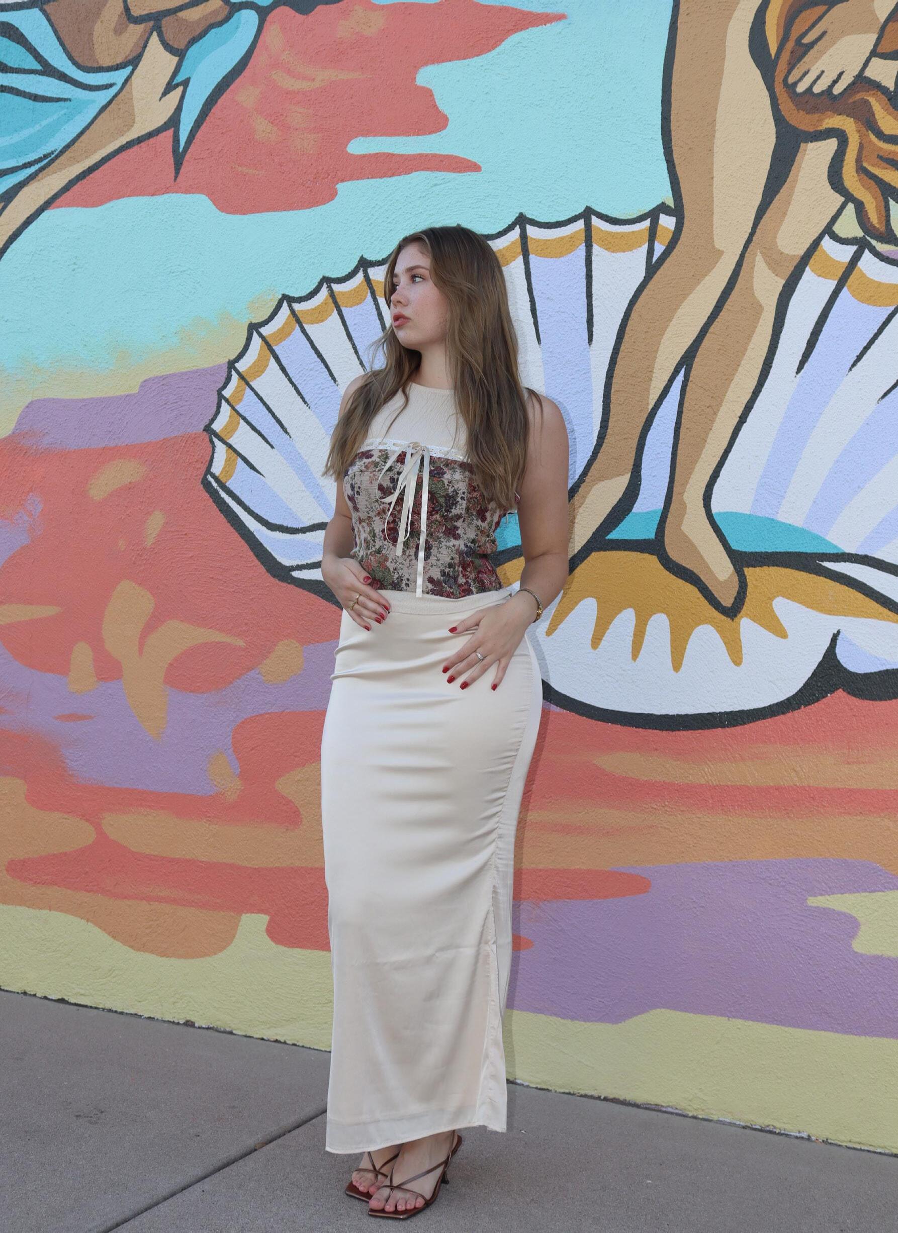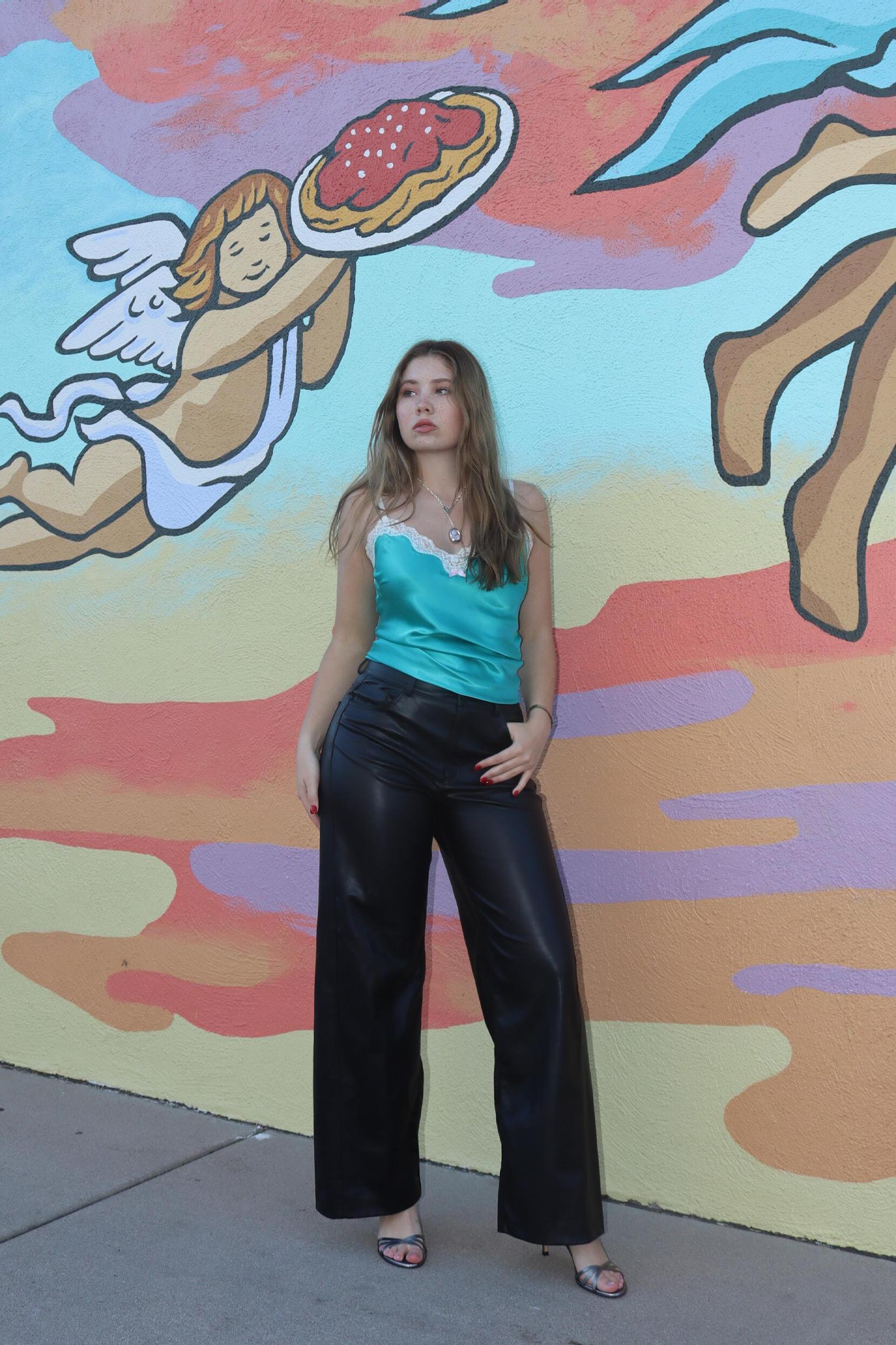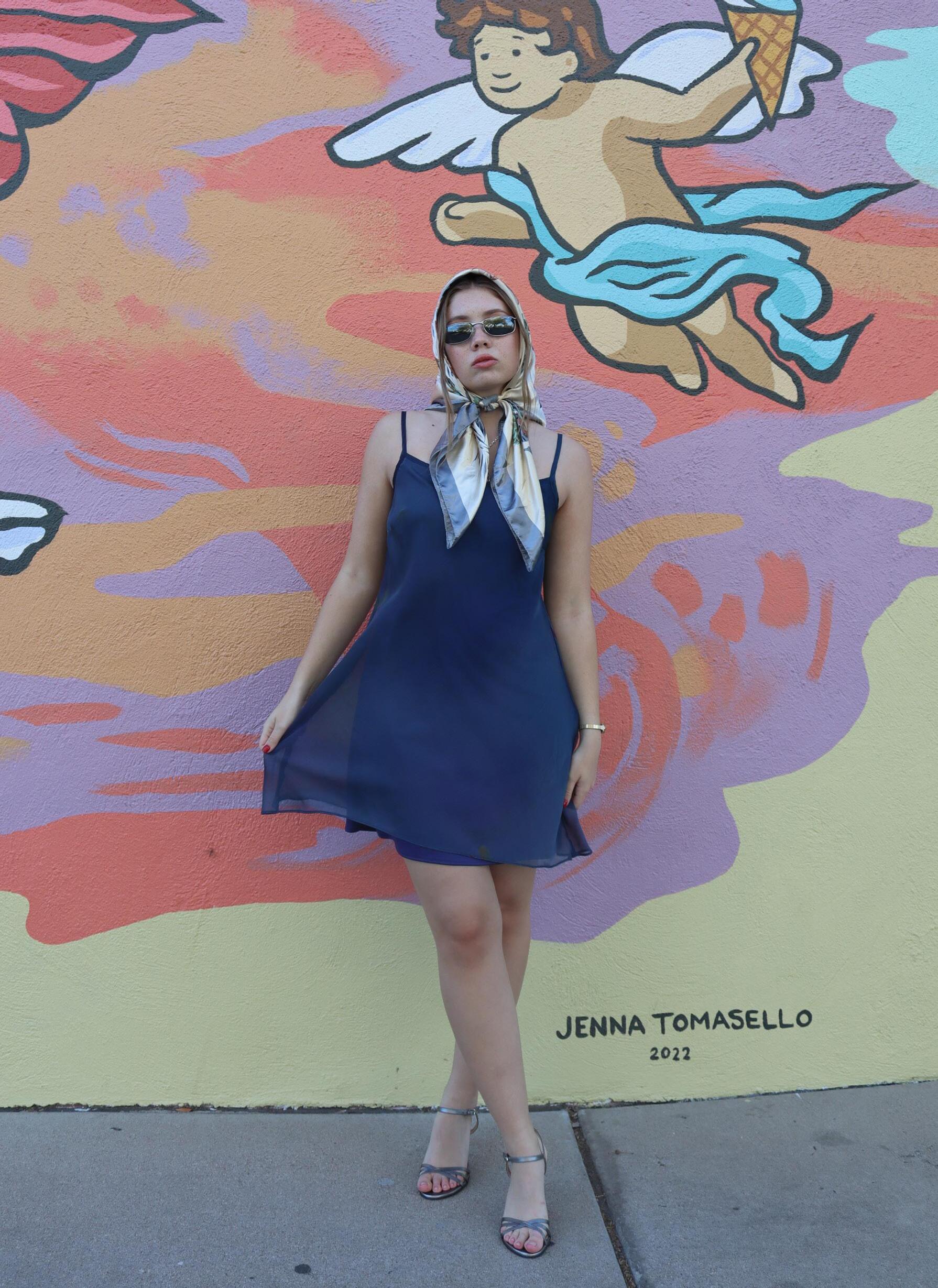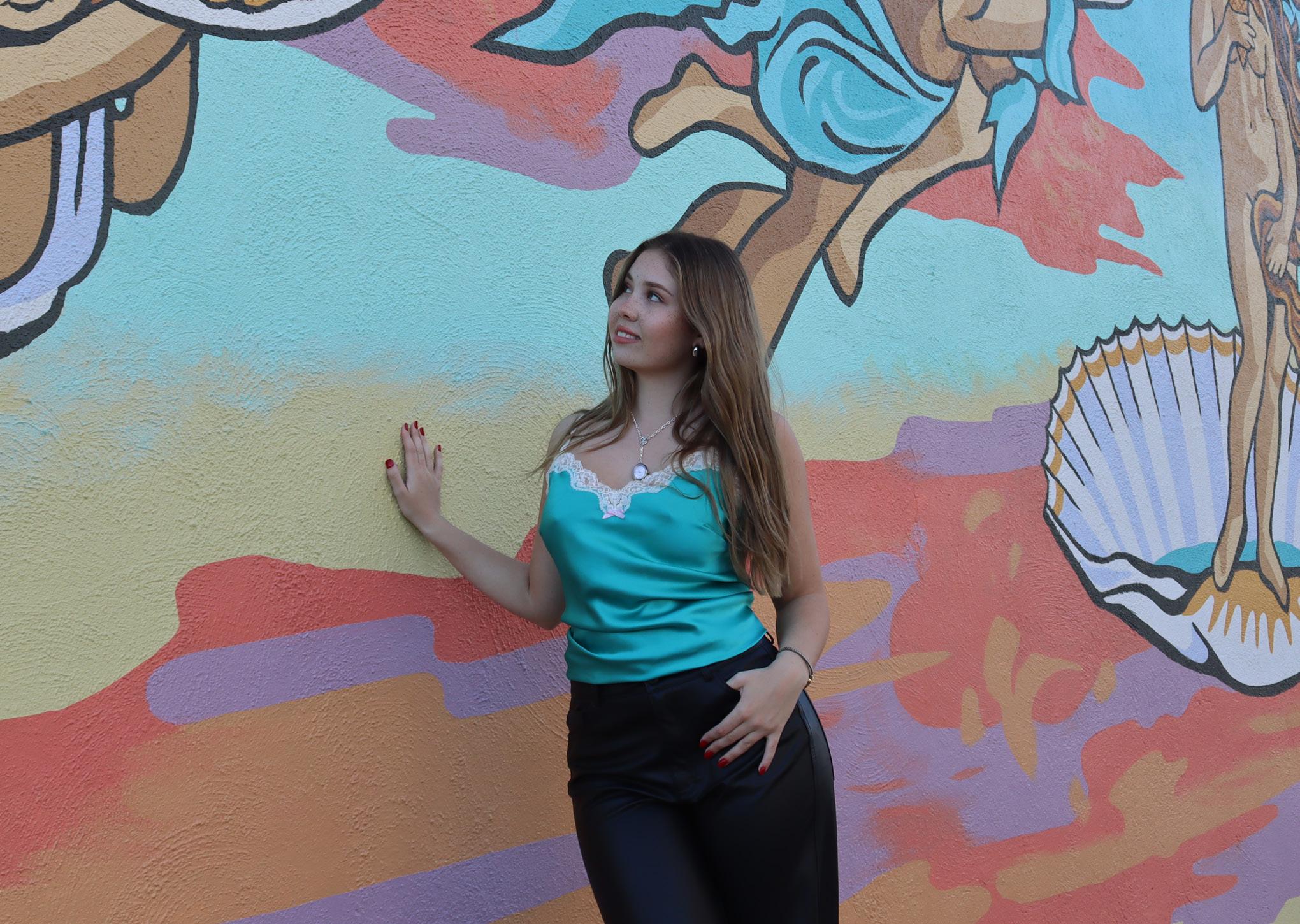 As a whole, my Look Book is inspired by the Duality of the Noodies Mural. Originally inspired by the classic “Birth of Venus” painting, Jenna Tomasello took her own creative spin by adding elements of Italian cuisine served in the restaurant. Although this mural is viewed by many as a fun, silly take of the famous Renaissance art, I see it as much more. It symbolizes the importance of embracing yourself fully and being yourself unapologetically, especially as a woman in today’s society. The “Birth of Venus” part of the mural shows the more widely accepted part of women, their physical beauty. People can view women as only ‘pretty things’ without a mind, a soul, or a heart. But women are so much more than that! They are fun, silly, and witty. They are intelligent, wise, and clever. They are thoughtful, generous, and kind. I see all of these valuable human traits, as the amusing pasta and gelato additions to Venus and her posse. So, while others see a comical mural combining Renaissance art with Italian food, I see an appreciation for accepting and appreciating all the qualities that make you, YOU! So, with my collection, I wanted to show qualities that represent this belief in embracing the duality of womanhood.