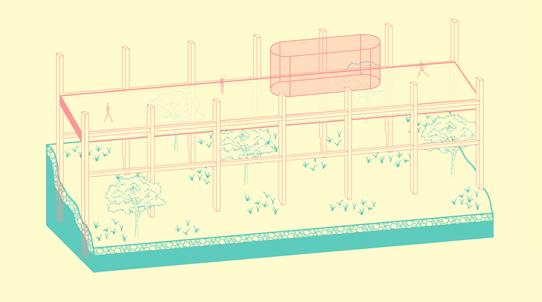 this stitching manifested itself as a structural grid which pinned the landscape down, and allowed native flora and fauna to reclaim the space beneath. within the frame, program was suspended which allowed the public commute from neighborhood, and to inhabit and experience the revitalized landscape.