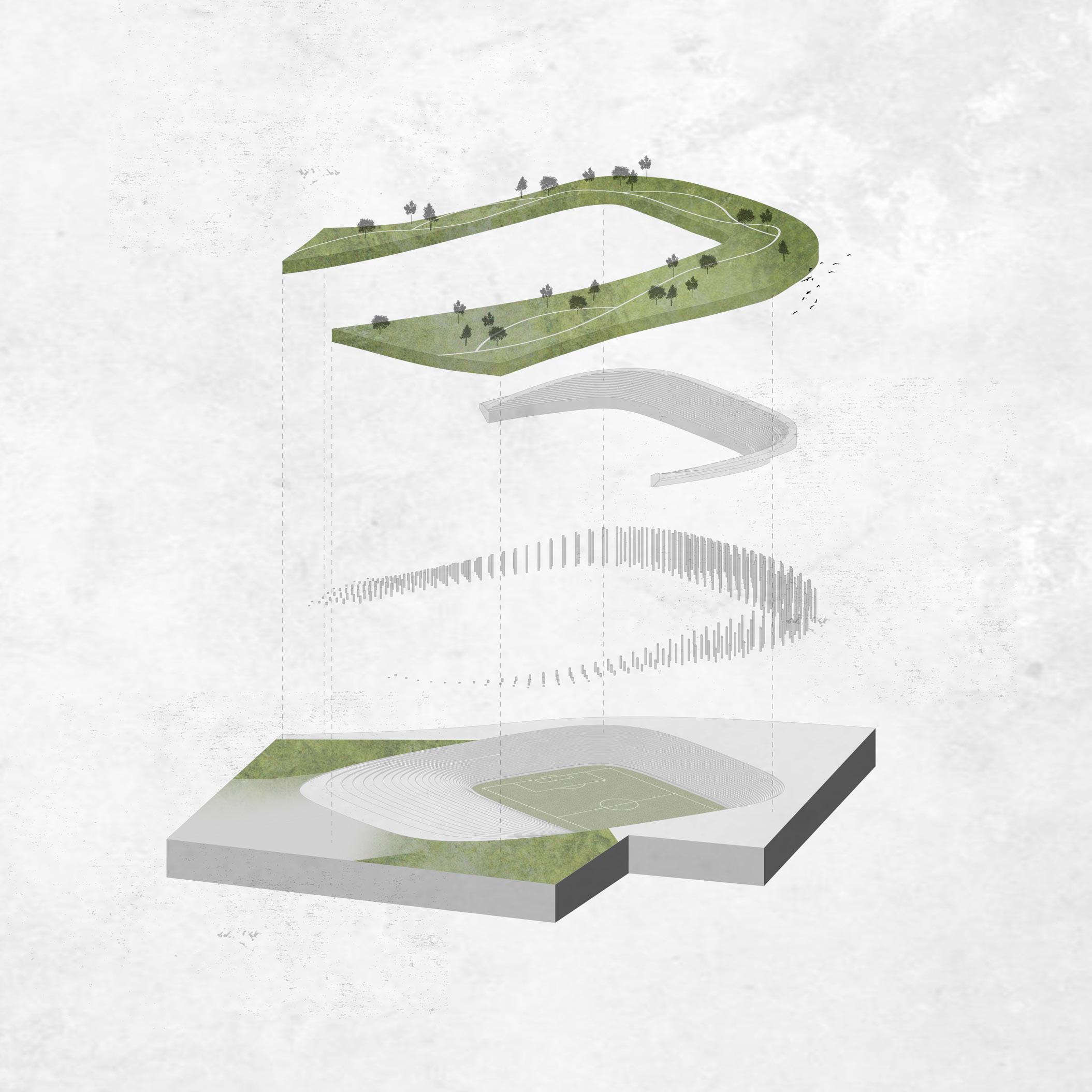 the green roof that creates the shell for the stadium can be used as a public park year round, long after the athletes have gone.
