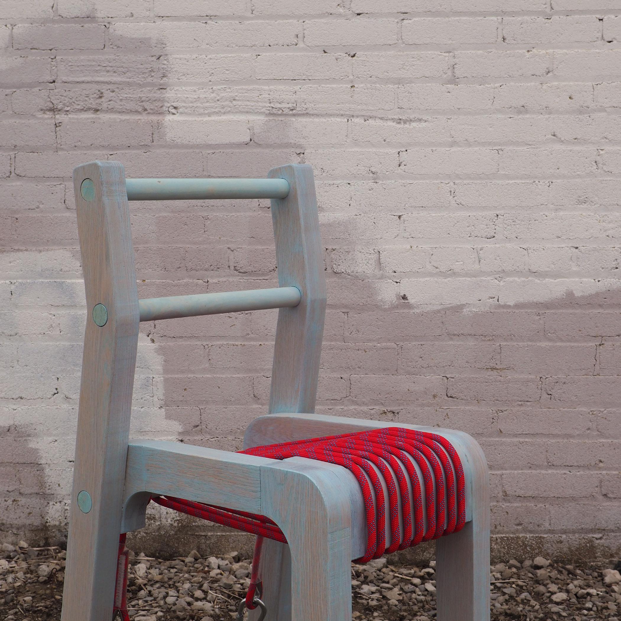 the design process began by observing a cheap plastic chair, and re-imagining the construction of the product, in order to replicate it out of wood. the initial plastic precedent eventually got lost in the creation of this functional yet unconventional piece. materials : white oak / hiking rope / screw eye processes : carpentry / weaving?