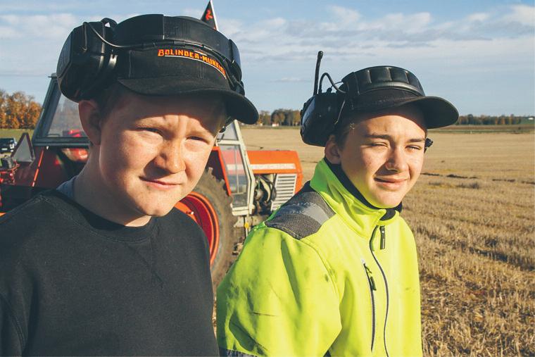 V i k t o r G u s t a v s s o n , 1 4 å r o c h h a n s k o m p i s O r v a r E v efjod, 13 år kör med van hand s i n t r a k t o r o c h p l ö j e r u n d e r ö v e r i n s e e n d e a v r e s p e k t i v e pappa