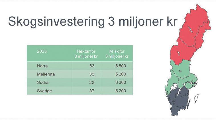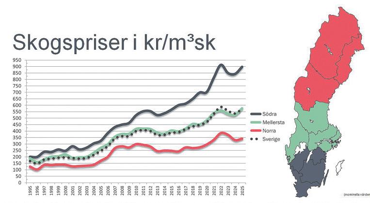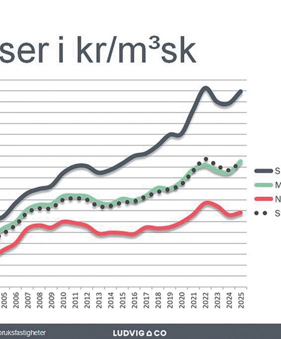 S KO G I d a g a r n a p re s e n t e r a d e Lu d v i g & Co Fastighetsförmedling & Skog statistiken för skogs- och åkermarkspriserna f ö r 2 0 2 5 F ö r r a h e l å r s r a p p o r t e n f ö r skogsmarkspriserna, då för 2024, visade v i k a n d e p r i s e r Sa m t i d i g t m e d d e l a d e man att det fanns tecken på att marknad e n s k u l l e k o m m a a t t å t e r h ä m t a s i g under senare halvan av 2025 Vändningen kom, dessutom snabbare än m a n t r o t t H a l v å r s r a p p o r t e n v i s a d e p å ett genomsnitt för riket på plus 5,7 procent Helårsrappor ten visar nu att uppgången hållit i sig och att genomsnittet för riket landar på plus 7,1 procent SIDAN 8