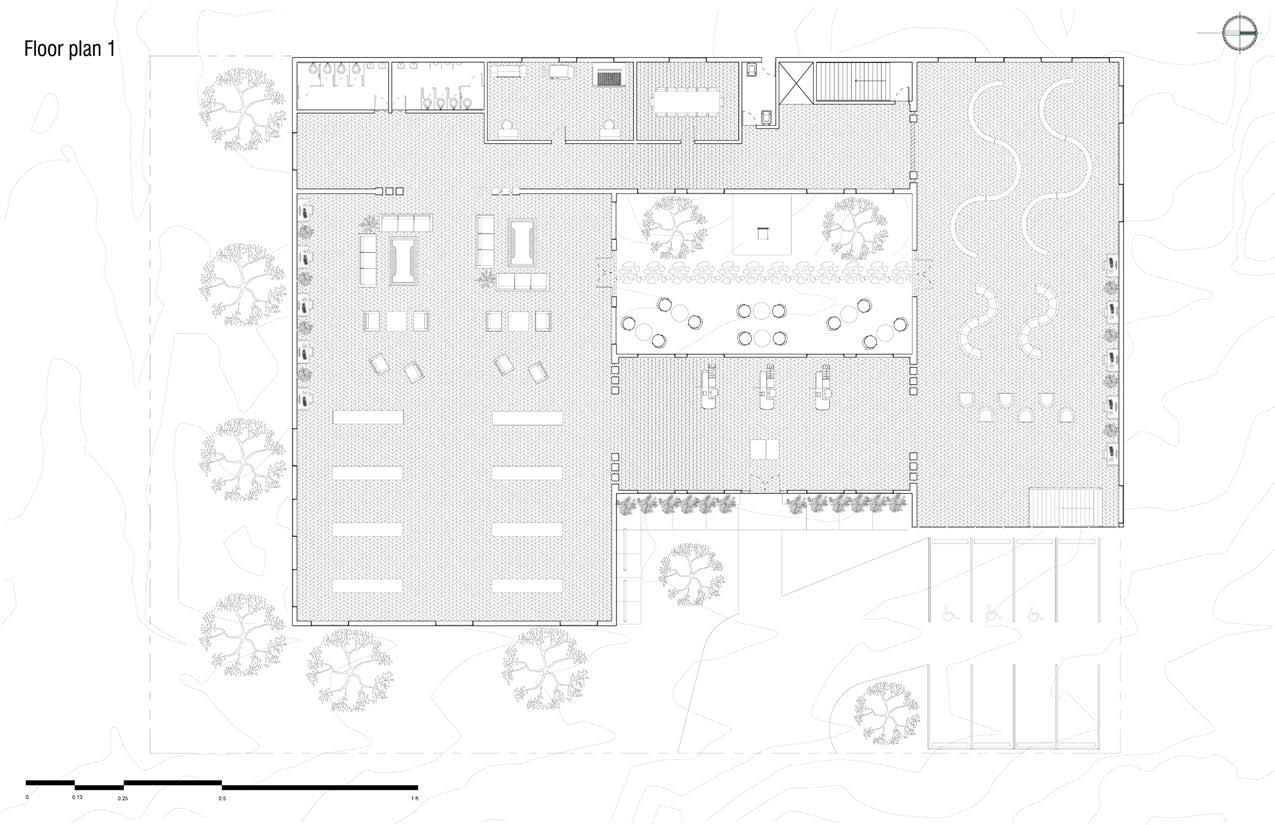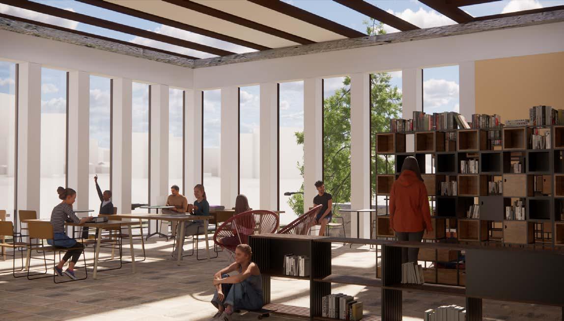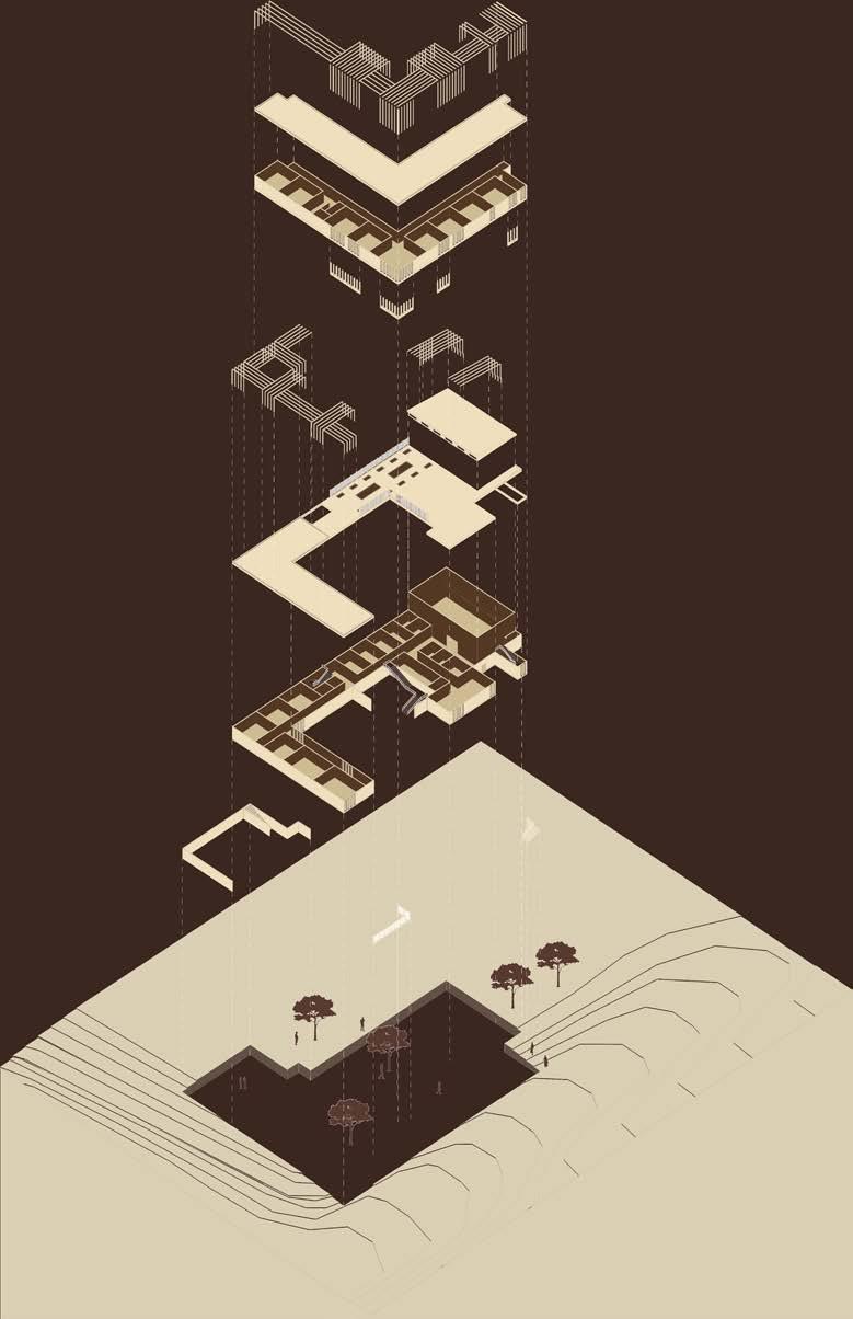 In the beginning of this structure, a library will occupy this space. It features book exploration areas that have the largest footprint on the site, including private rooms for isolated studies, an exhibition area on the top floor for events, and the private office for the librarian in existance.