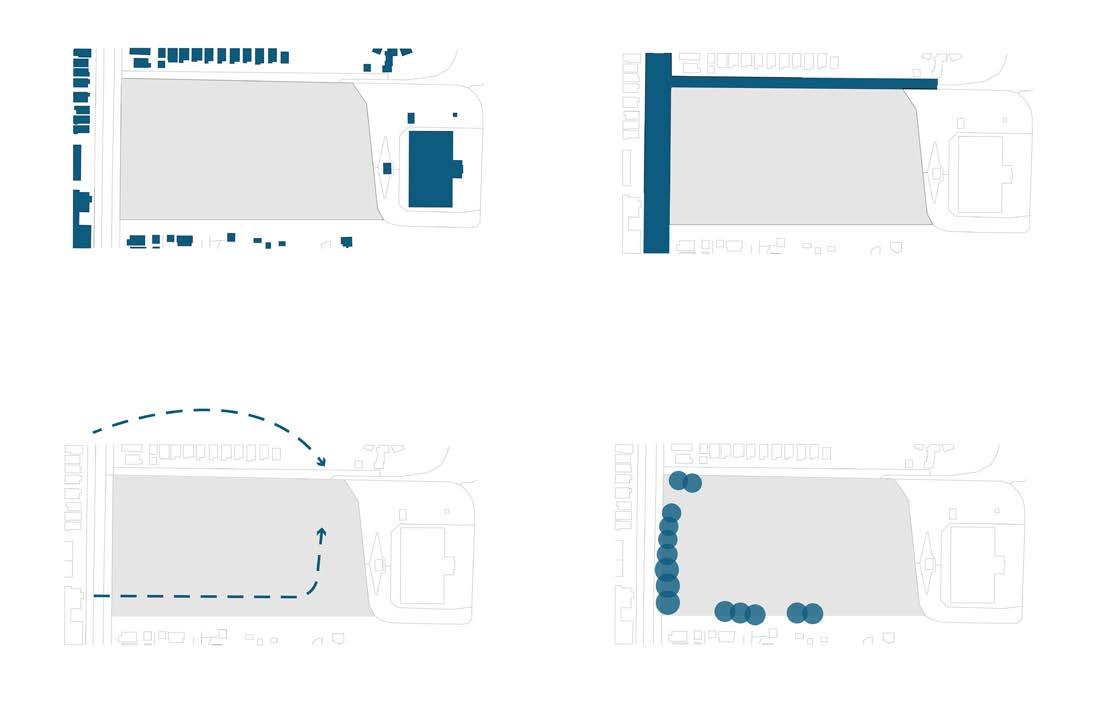 Shows a series of extrusions from the form that takes most of the site. The Chosen form is to not hinder the view of the Mural drawn by Ella & Pitr.