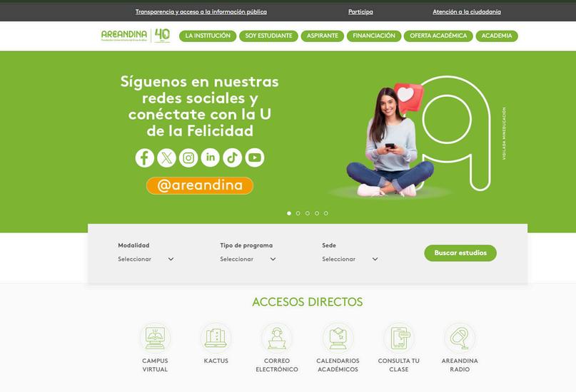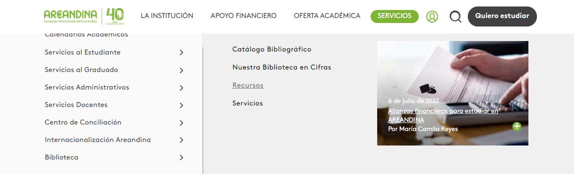 La página de la Fundación Universitaria del Área Andina brinda diferentes herramientas que están a disposición del estudiante las cuales buscan facilitar su proceso académico se encuentra desde la normatividad, hasta los servicios de Bienestar institucional, recursos digitales como la Biblioteca virtual todo en búsqueda de ampliar sus conocimientos.