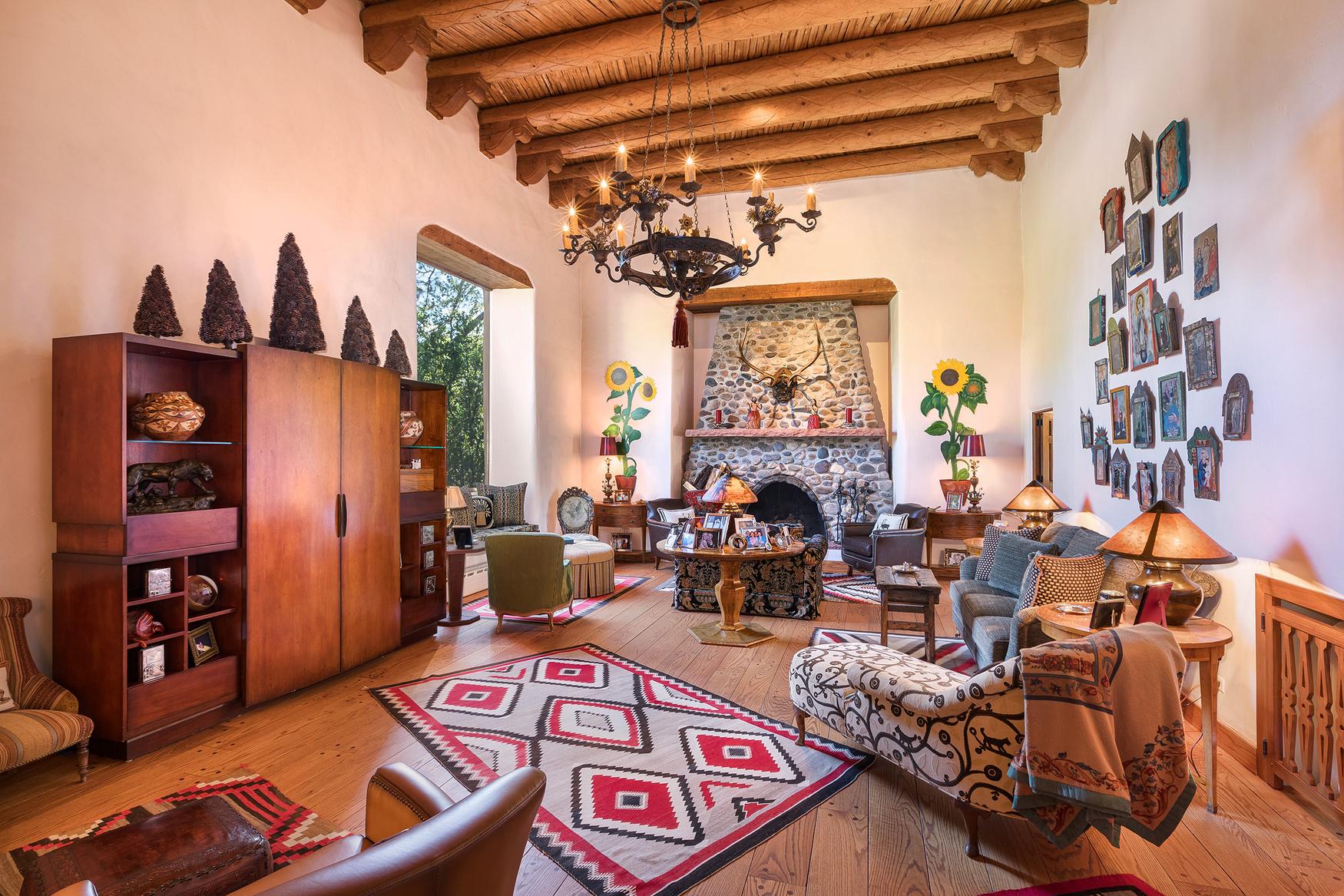 The primary residence is the finest example of Pueblo style Spanish Colonial architecture in Santa Fe, built in 1918 and fully restored with original doors, windows, lintels, vigas, and extraordinary coved and carved ceilings, with spacious volume throughout.