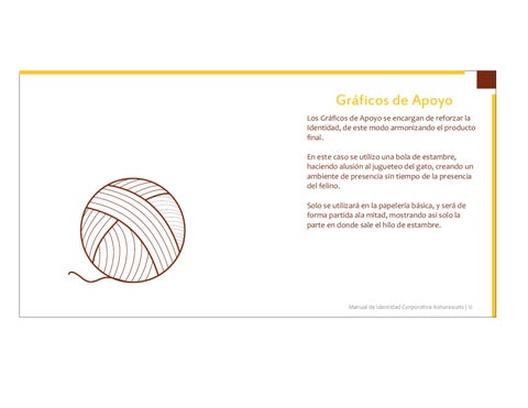 Gráficos de Apoyo Los Gráficos de Apoyo se encargan de reforzar la Identidad, de este modo armonizando el producto final. En este caso se utilizo una bola de estambre, haciendo alusión al jugueteo del gato, creando un ambiente de presencia sin tiempo de la presencia del felino. Solo se utilizará en la papelería básica, y será de forma partida ala mitad, mostrando asi solo la parte en donde sale el hilo de estambre.