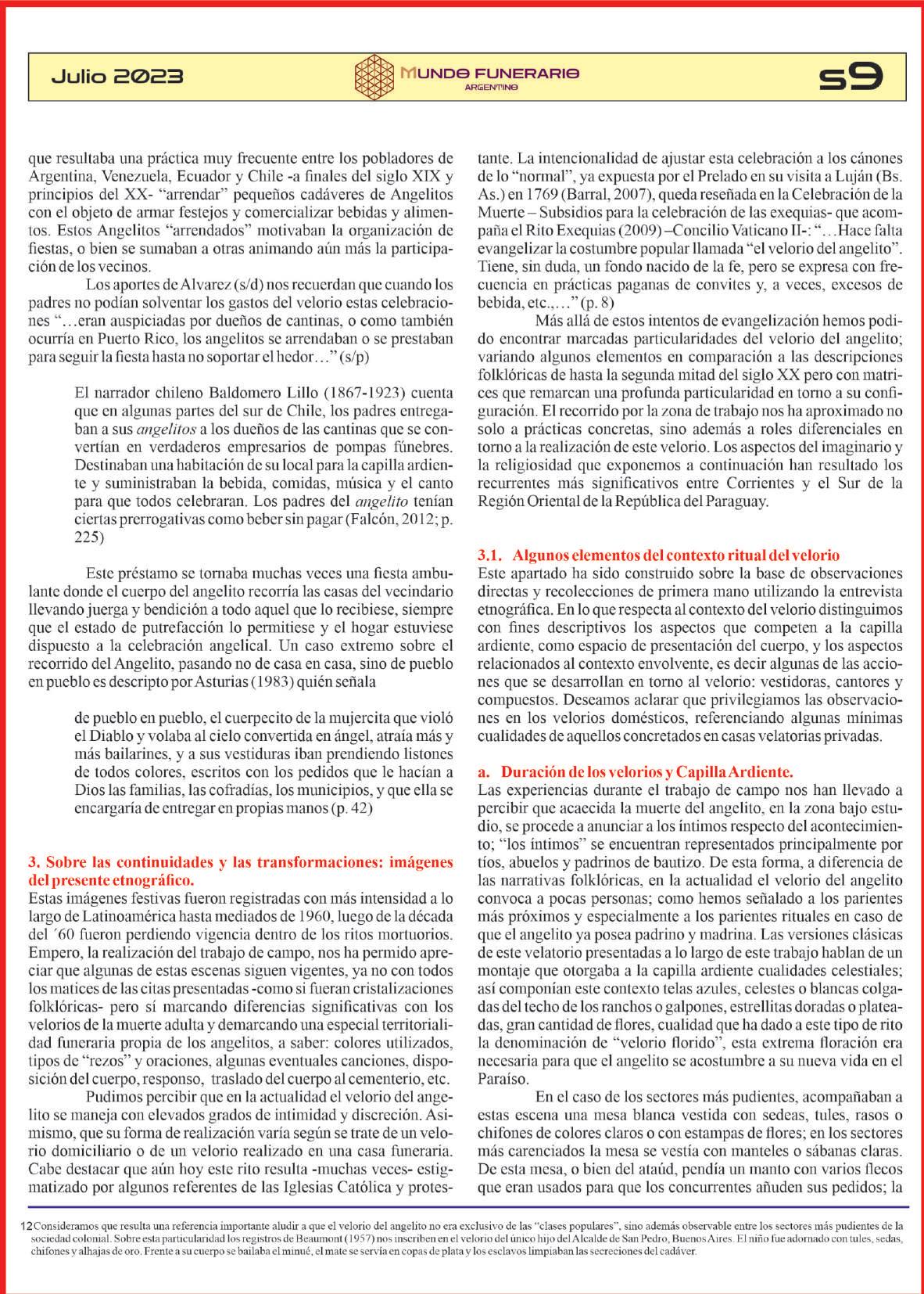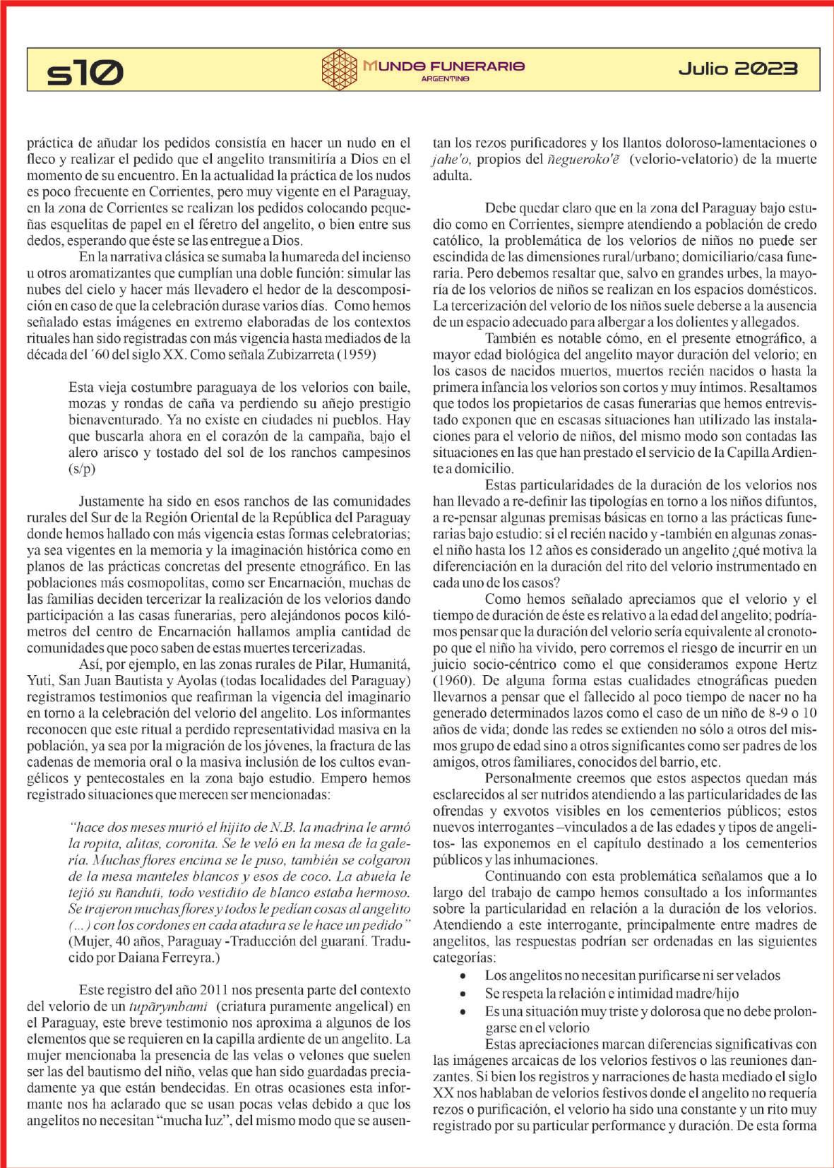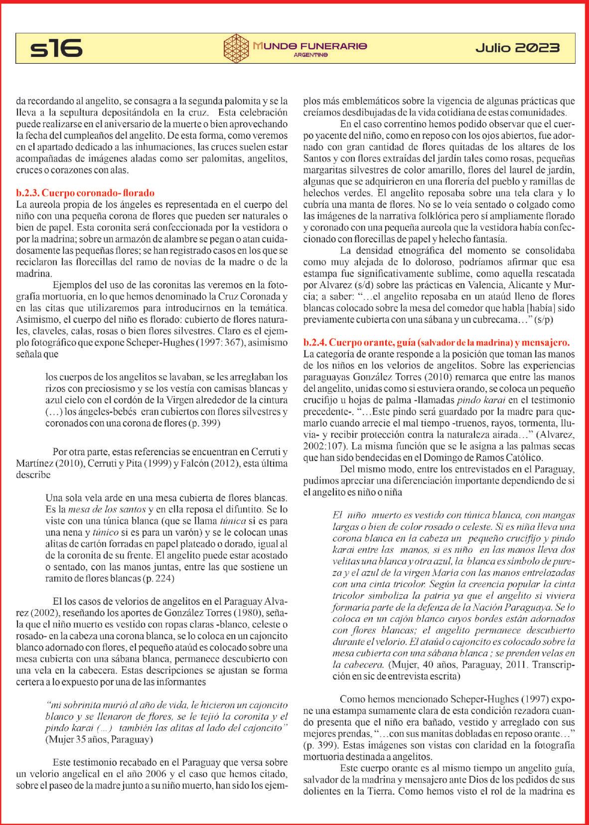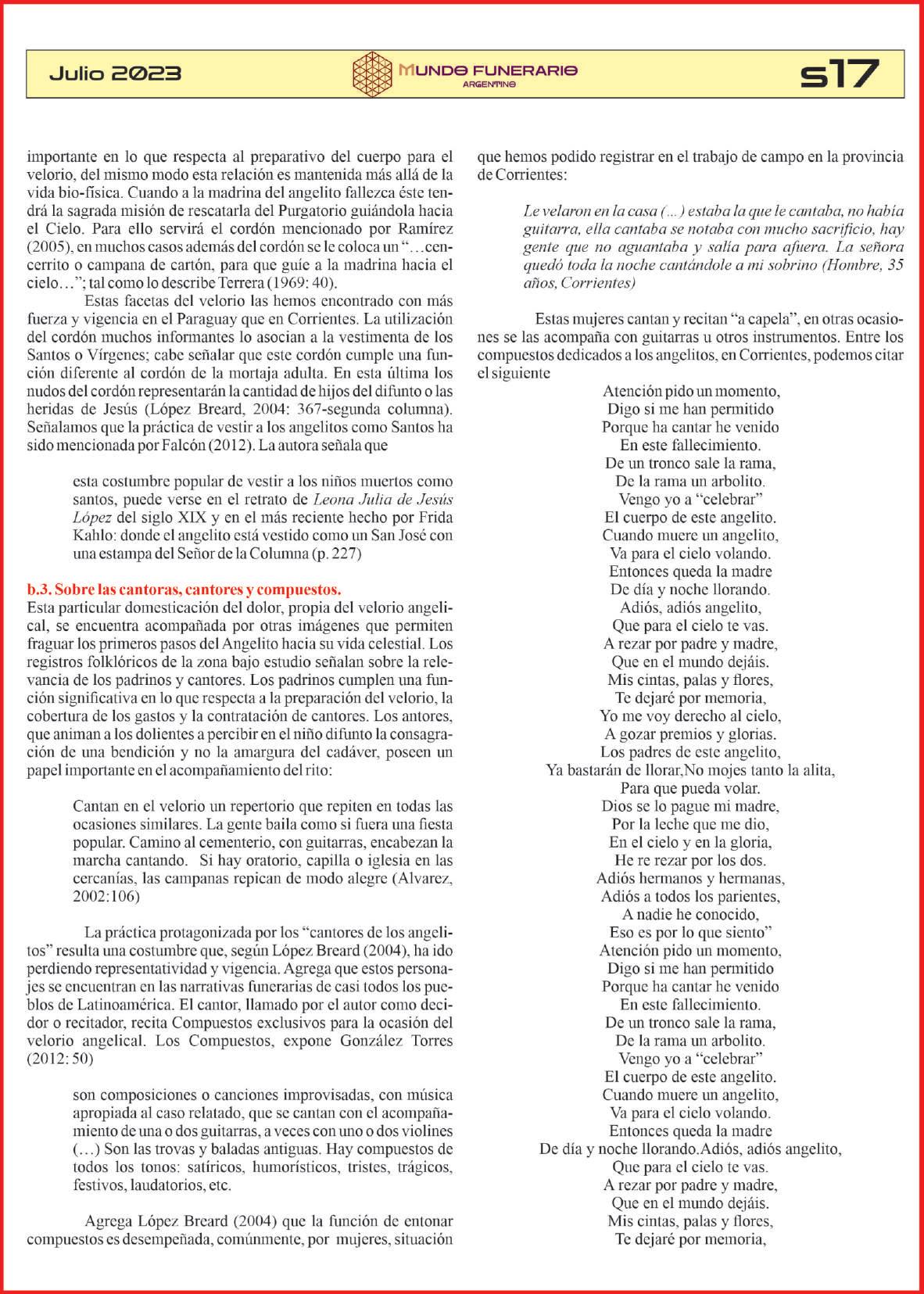 Por su parte Salas (2004) expone que en todos los casos referidosabundanpersonajespopularescomoserrezadoras,lloronasyllamadores,estosúltimossonlosencargadosdecomunicaral cuerpoque“hallegadolahoradellevarloalcementerio”,contres golpesenelcajónyalavozde“vamos(dicennombre)”,anuncian alalmaquedebeacompañaralcuerpoynoquedarpenandoporel lugar El llamador, las lloronas (denominadas en Paraguay como ñembo'e ýva)yelnovenariosonprácticasexclusivasdelamuerte adulta; estas formas no se encuentran vinculadas a la muerte de angelitosyaquesepresuponequeelniñononecesitapurificarsu almaconlosrezosdelnovenario,tampoconecesitalloronasensu veloriooelllamamientoparaseguirsucuerpoalentierro.