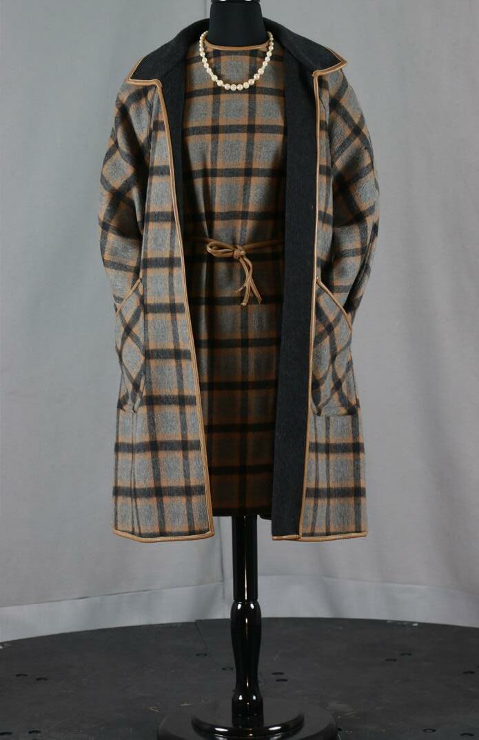 Right: Wool jumper and matching coat, designed by Bonnie Cashin, ca. 1965. Donor: Beatrice F. Auerbach. UConn 1965.7a, b.